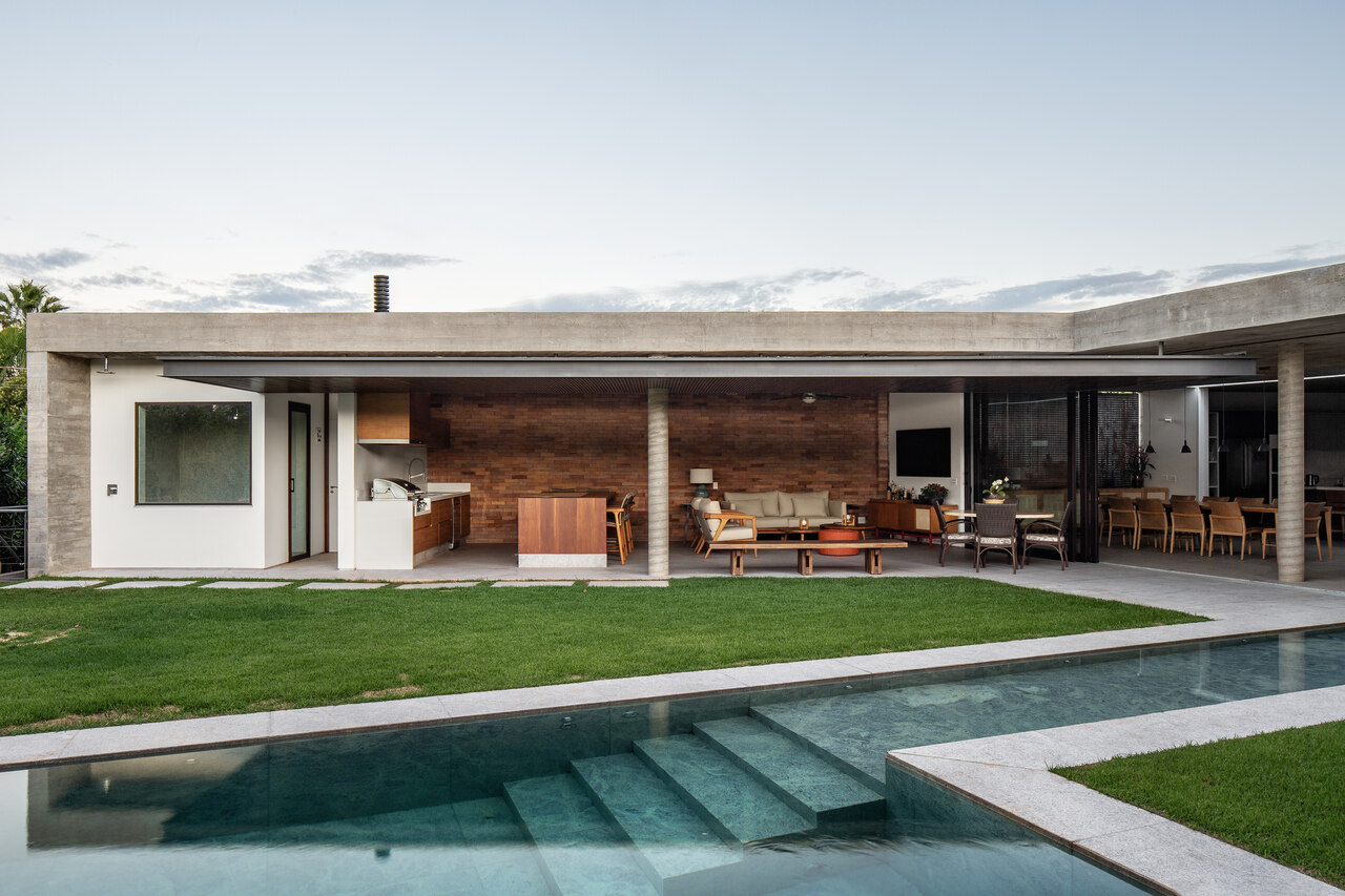 Com 400 m2, a casa foi projetada pelo arquiteto Reinach Mendonça para uma família composta pelo casal e dois filhos menores. O concreto aparante no teto e nas vigas revisita a arquitetura moderna de Paulo Mendes da Rocha e Vilanova Artigas, autor do projeto arquitetônico do prédio de arquitetura da FAU-USP. A madeira, em forma de ripas, se contrapõe ao concreto. Fachada e teto, da área da churrasqueira, foram revestidos de madeira, equilibrando a sensação de frieza que o concreto transmite.