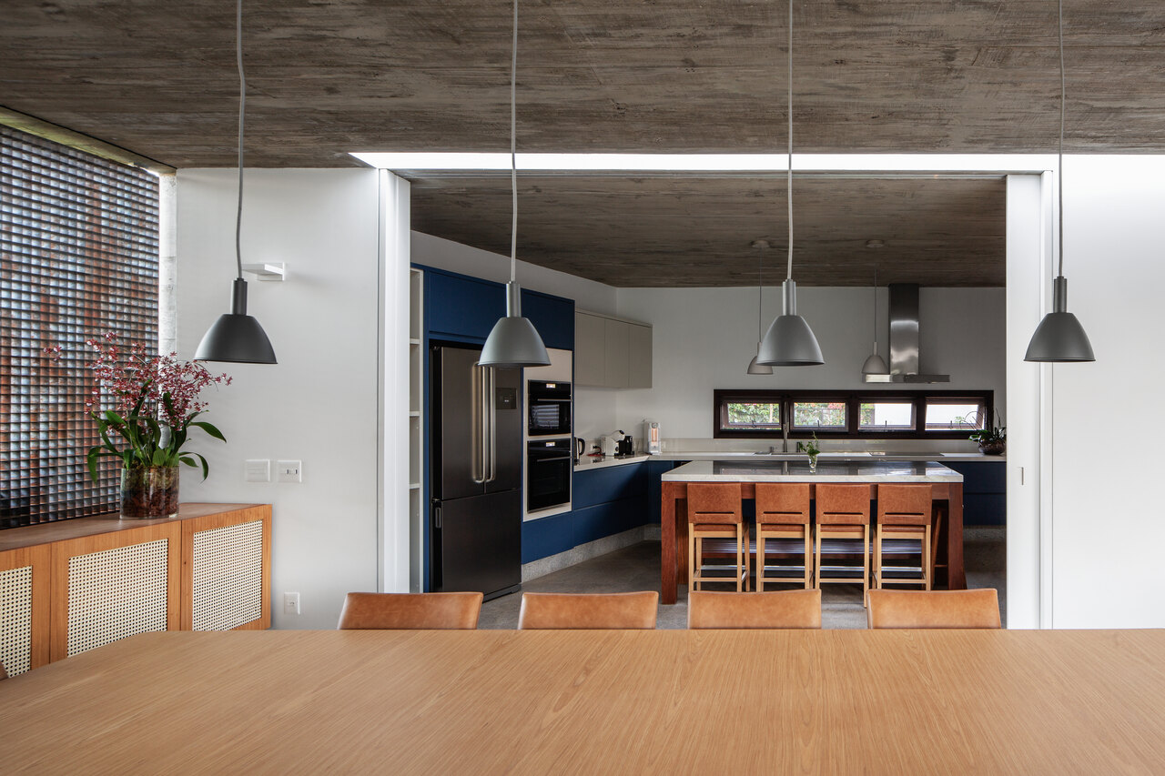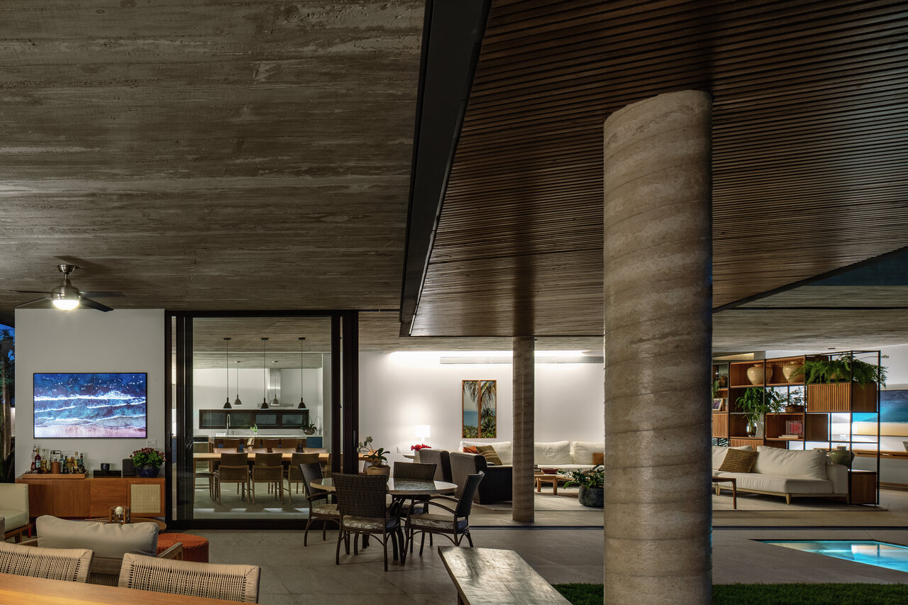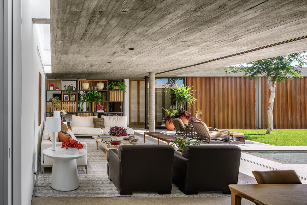 Com 400 m2, a casa foi projetada pelo arquiteto Reinach Mendonça para uma família composta pelo casal e dois filhos menores. O concreto aparante no teto e nas vigas revisita a arquitetura moderna de Paulo Mendes da Rocha e Vilanova Artigas, autor do projeto arquitetônico do prédio de arquitetura da FAU-USP. A madeira, em forma de ripas, se contrapõe ao concreto. Fachada e teto, da área da churrasqueira, foram revestidos de madeira, equilibrando a sensação de frieza que o concreto transmite.
