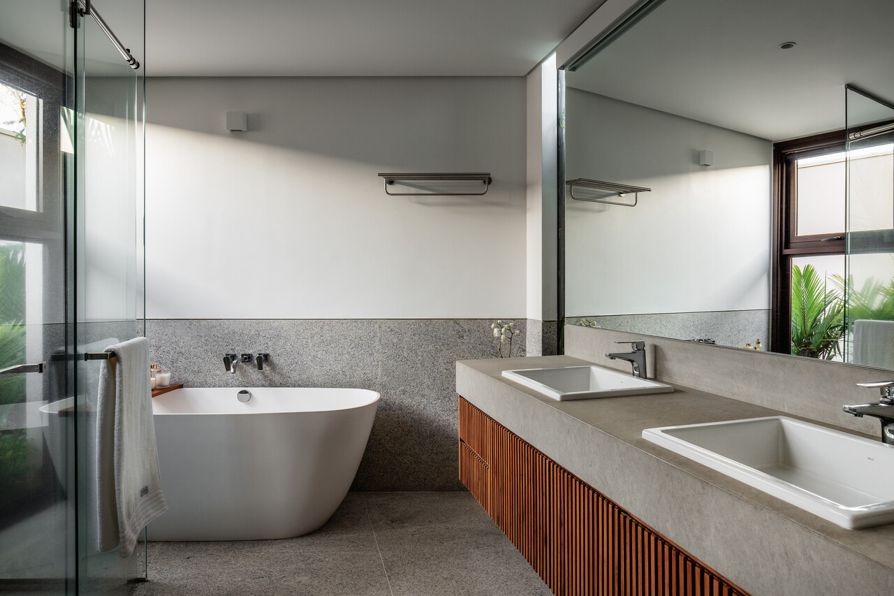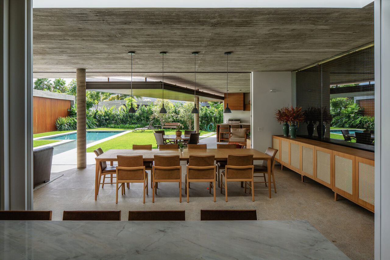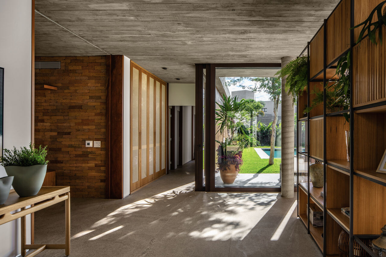 Com 400 m2, a casa foi projetada pelo arquiteto Reinach Mendonça para uma família composta pelo casal e dois filhos menores. O concreto aparante no teto e nas vigas revisita a arquitetura moderna de Paulo Mendes da Rocha e Vilanova Artigas, autor do projeto arquitetônico do prédio de arquitetura da FAU-USP. A madeira, em forma de ripas, se contrapõe ao concreto. Fachada e teto, da área da churrasqueira, foram revestidos de madeira, equilibrando a sensação de frieza que o concreto transmite.
