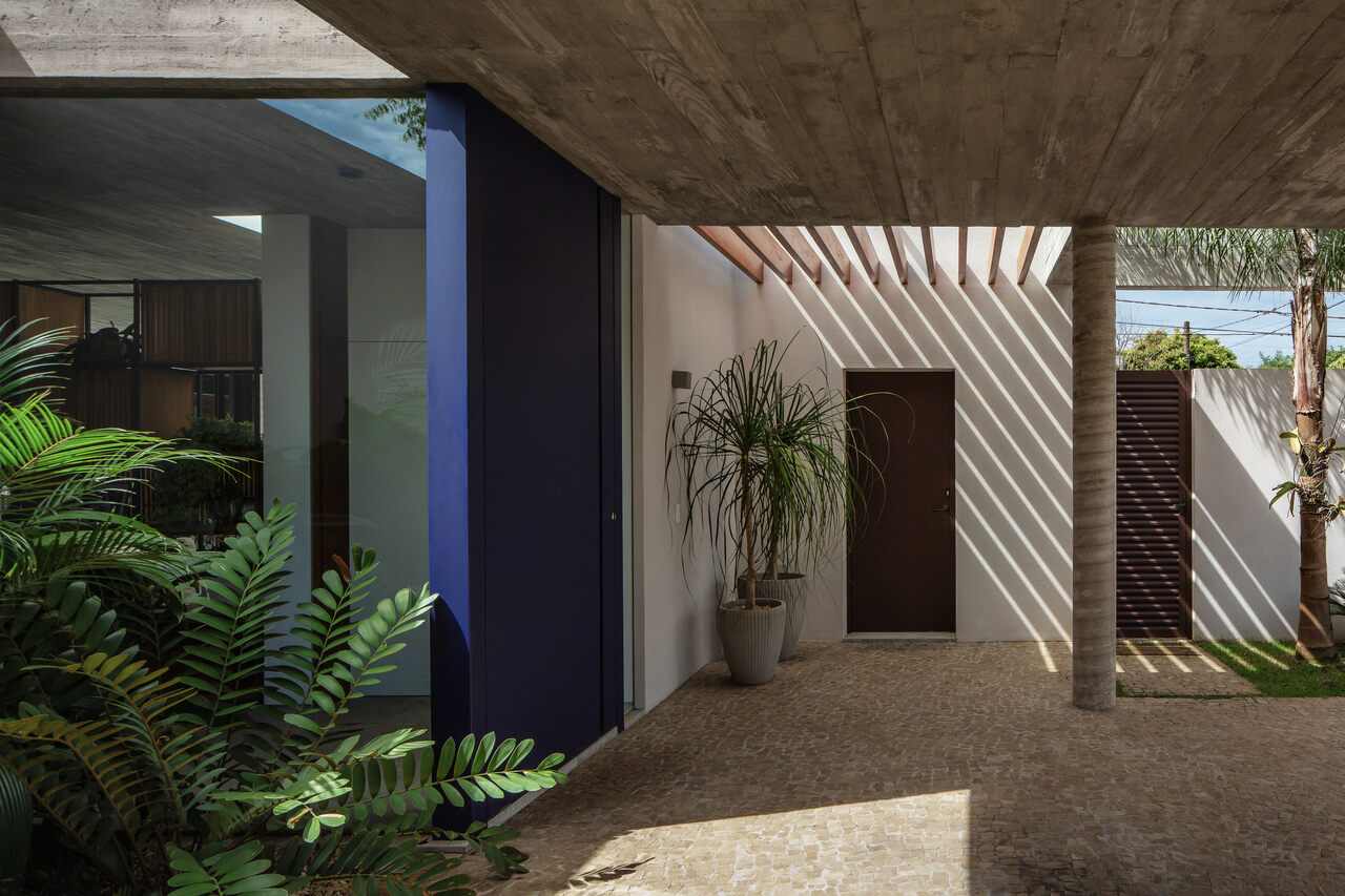 Na área íntima, estão três quartos e cinco banheiros, que comportam confortavelmente a todos. A arquiteta utilizou uma paleta de cores neutra, com exceção do azul presente na porta de entrada.