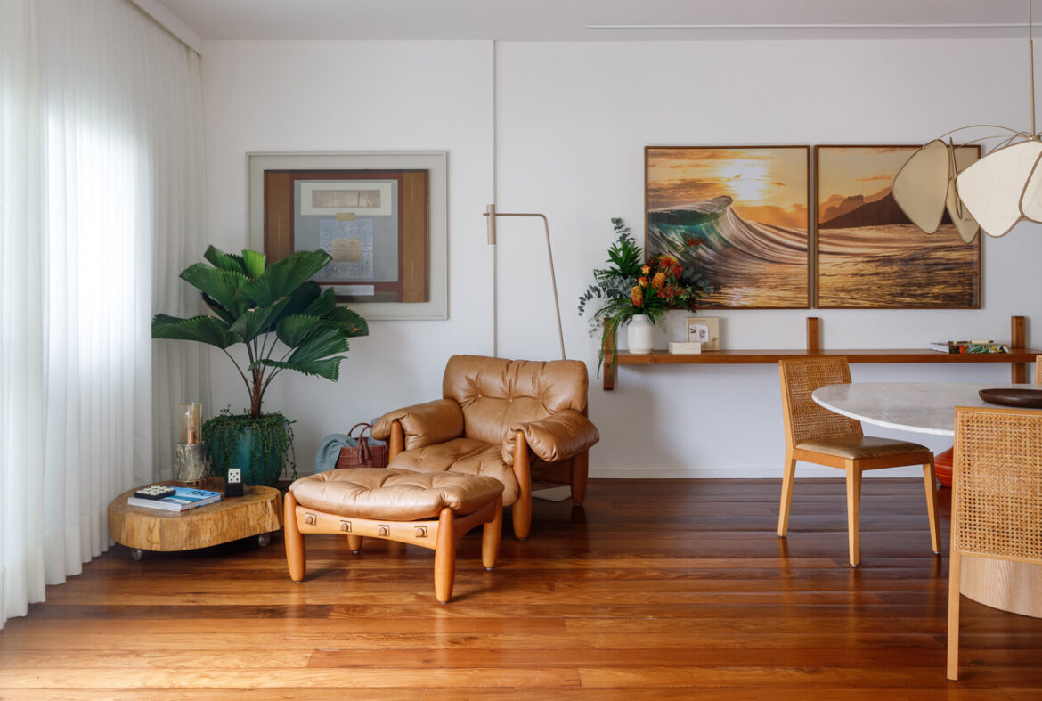 Apartamento para jovem casal aposta em integração, arte e madeira como protagonistas