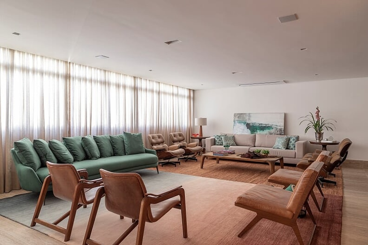 Neste projeto, o escritório utilizou na parede principal um sofá reto e de cor neutra que, por sua vez, alinhou-se com as quatro poltronas Charles Eames. No lado esquerdo, a profissional inseriu um sofá curvo com tecido tecnológico verde, usado para ver a TV localizada no painel à frente. | Foto Rafael Renzo