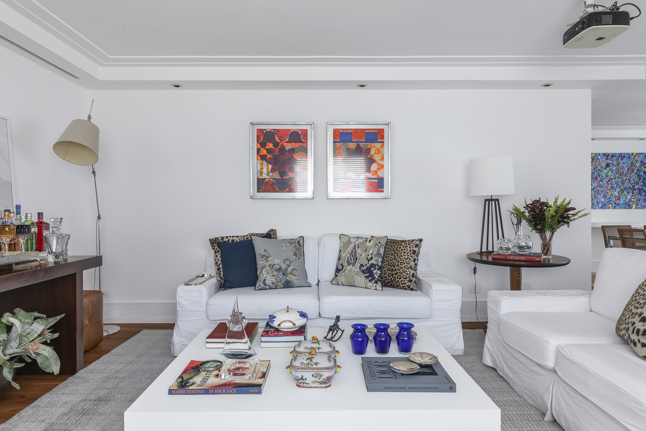 Neste projeto, a arquiteta optou por sofás mais despojados, com capas de sarja branca. Assim, deixou para inserir as cores no restante do ambiente como nas almofadas, objetos e quadros, assim como no tapete com textura. Foto | Rafael Renzo