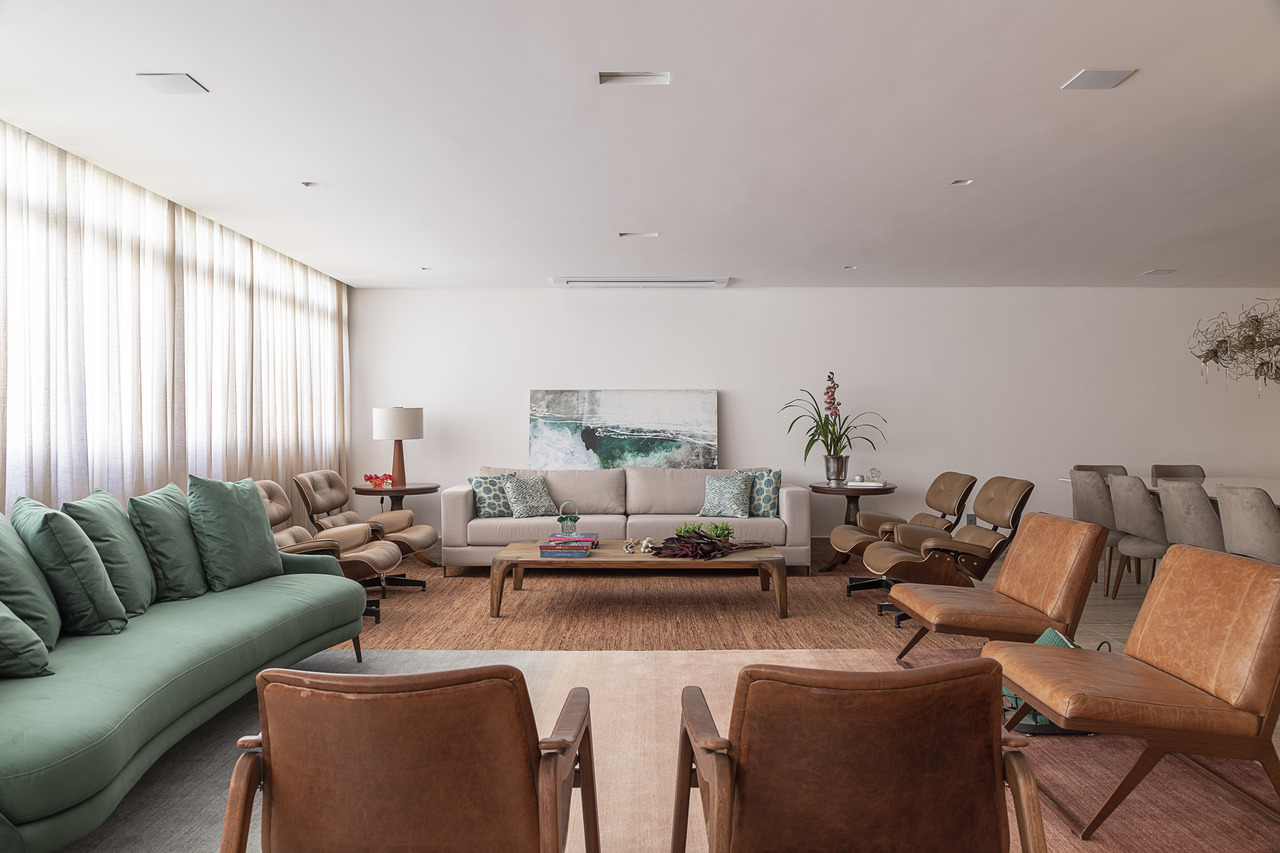 Neste projeto, o escritório utilizou na parede principal um sofá reto e de cor neutra que, por sua vez, alinhou-se com as quatro poltronas Charles Eames. No lado esquerdo, a profissional inseriu um sofá curvo com tecido tecnológico verde, usado para ver a TV localizada no painel à frente. | Foto Rafael Renzo