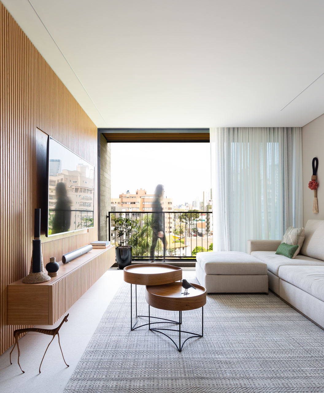 O escritório trouxe mais estilo e personalidade ao projeto com a presença ilustre de um painel ripado; o item possui uma estrutura simples e versátil que funciona bem como divisória de ambiente, painel na sala de estar, parede de destaque no escritório, cozinha ou banheiro e cai bem até mesmo em ambientes externos, oferecendo uma atmosfera moderna e aconchegante a qualquer que seja a função escolhida. “Neste projeto além do painel ripado, desenhamos um aparador para esconder os aparelhos de streaming, sem perder a continuidade visual e funcionalidade”, garante a profissional.