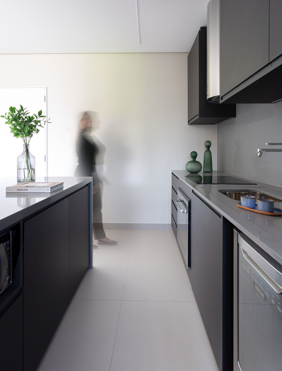 Com projetos residenciais cada vez menores, a cozinha estilo corredor se faz presente em cada vez mais lares, além disso, em ambientes pequenos é indicado também que seja utilizado tons claros e neutros para criar a sensação de que o espaço. “Mas como toda “via de regra” tem sua exceção, neste projeto optamos por utilizar também cores escuras- sem perder a sensação de amplitude tão necessária em um espaço pequeno, para isso utilizamos a cor escura apenas nos armários, mantemos o tom claro no restante e caprichando na iluminação”, comenta a arquiteta Gabriela Casagrande.