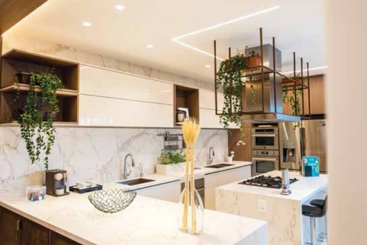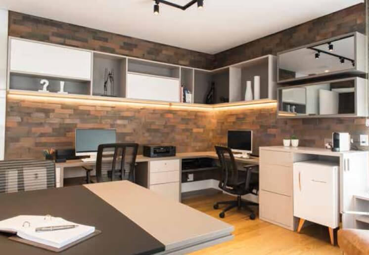COM UM JOGO DE VOLUMES PREENCHIDOS POR PORTAS SEM PUXADORES, PORTAS ESPELHADAS E NICHOS, A MARCENARIA DESSE OFFICE SE DESTACA, NA PAREDE DE TIJOLINHOS QUE REMETEM AO ESTILO INDUSTRIAL, BEM COMO A ILUMINAÇÃO INDIRETA COM SPOTS EXTERNOS. NA COZINHA, BANCADAS E PAREDES REVESTIDAS COM DEKTON CONFEREM PRATICIDADE E ELEGÂNCIA AO ESPAÇO. NA SALA, COMO O OBJETIVO ERA SEPARAR OS AMBIENTES QUANDO NECESSÁRIO, O PAINEL AMADEIRADO COM PORTAS DE CORRER EMBUTIDAS INTEGRA O HALL SOCIAL AO LIVING, ATRAVÉS DOS