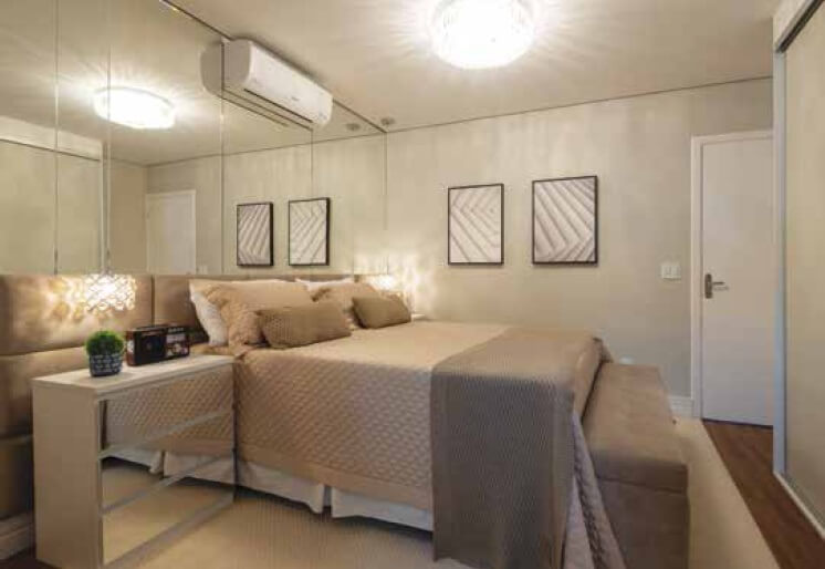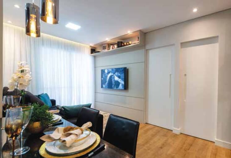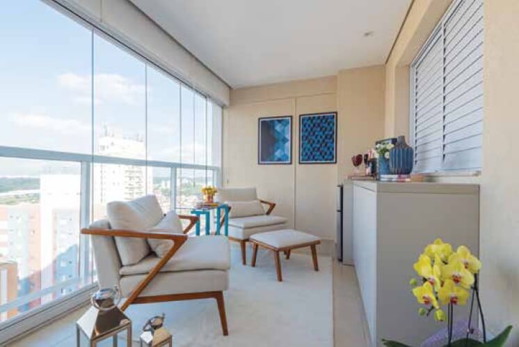 O apartamento de 63 m², em São Paulo, mistura minimalismo com um toque delicado de sofisticação. A varanda em tons pasteis qualificam a sensação de bem-estar e promovem sensação de acolhimento ao local. O jogo de cores em tons primários de azul, vermelho e amarelo, completam o tom principal com leveza e alegria. No quarto do casal, a escolha por espelhos foi uma estratégia para ampliar visualmente o ambiente composto por cores sóbrias e de fundo neutro.