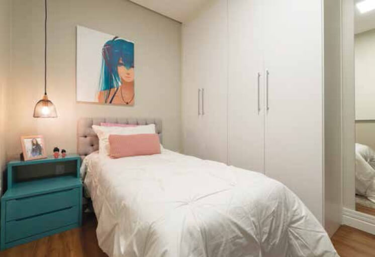 O segundo dormitório traz a jovialidade em tons frios, combinada a um toque de cor semelhante na cômoda, quadro e almofadas. A base clean composta por paredes, piso e bancada branca, deixa todo o destaque por conta da parede principal, dentro do box, revestida com cerâmica em formato de tijolo, aplicado em amarração, mas que faz referência ao mármore no acabamento. Uma releitura do estilo industrial com interferências clássicas.