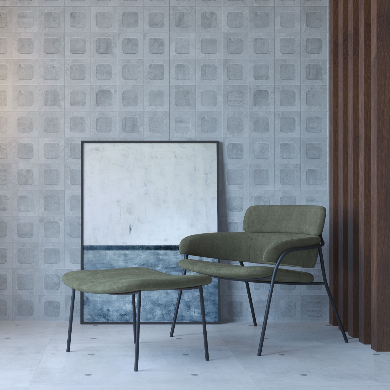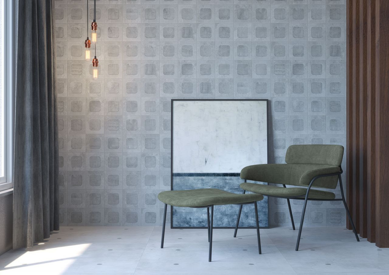 O azulejo Bloco possui um relevo sutil e grafismos evidentes do concreto aparente.
