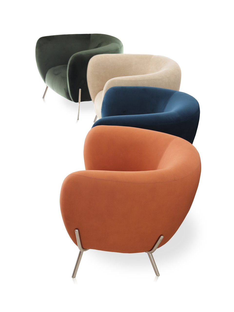Poltrona Ker, assinada pelo Estúdio Muuh, disponível em 14 cores nos tecidos Sevilla, Montreal e veludo.