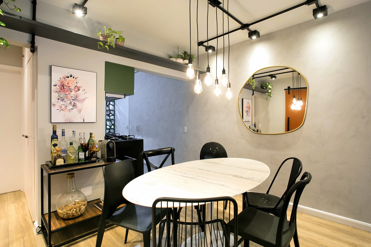 Na sala de jantar, o mix entre diferentes modelos de cadeiras, mas todas na cor preta, presente em boa parte do mobiliário. O uso de eletrodutos externos e o cimento queimado nas paredes referenciam ao estilo industrial