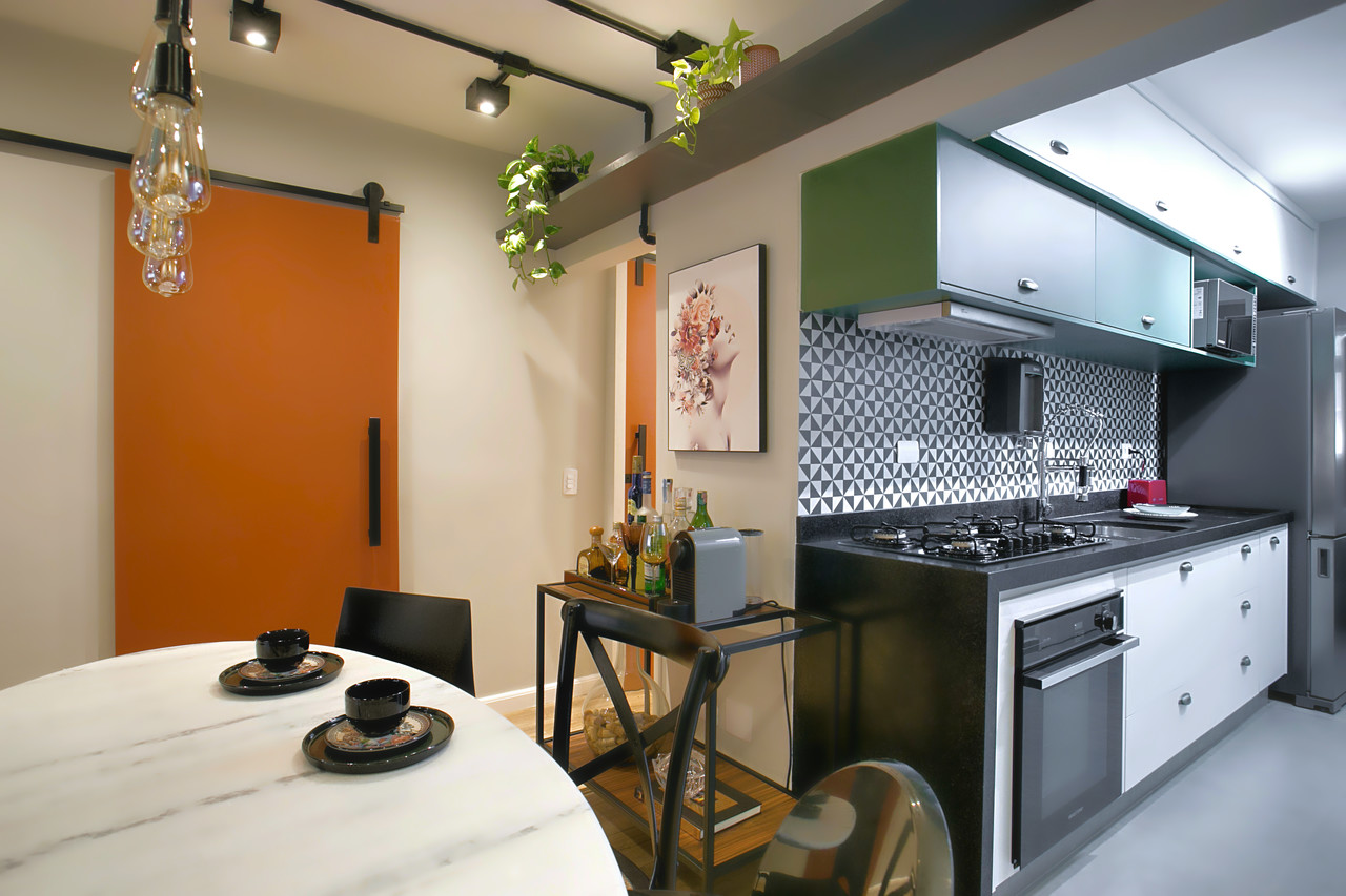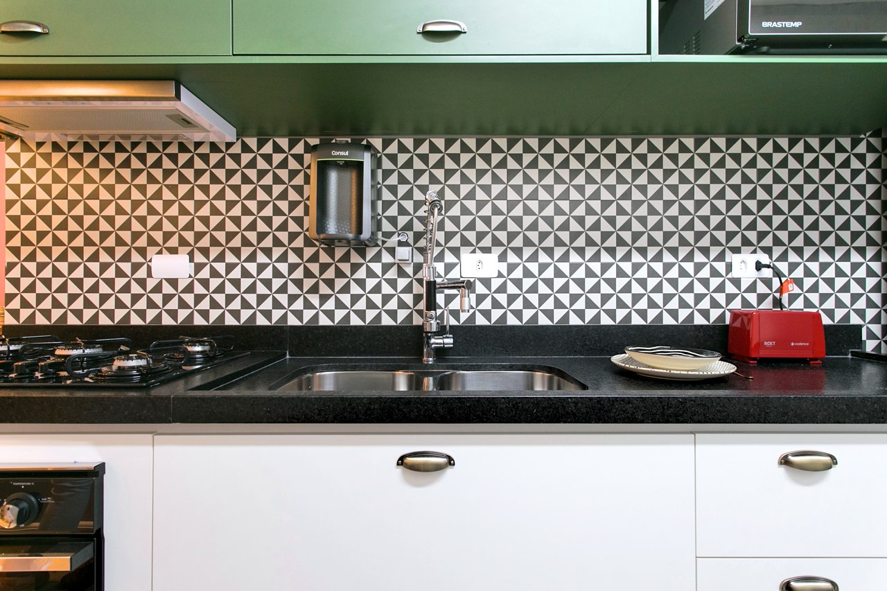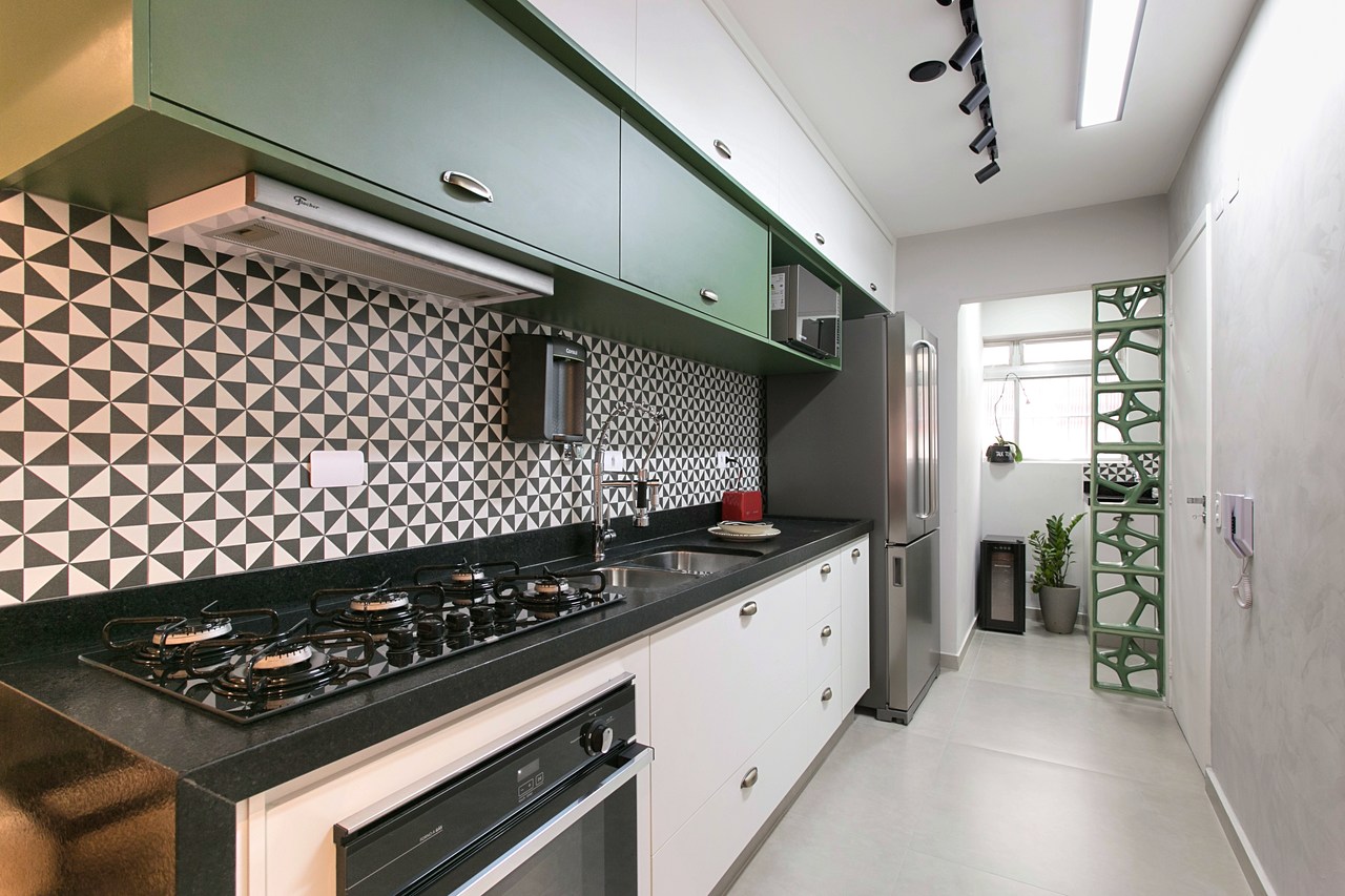 A cor verde utilizada no living se estende para os armários da cozinha, que também tem elementos em preto, como a pedra utilizada na bancada.