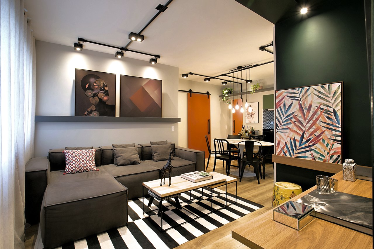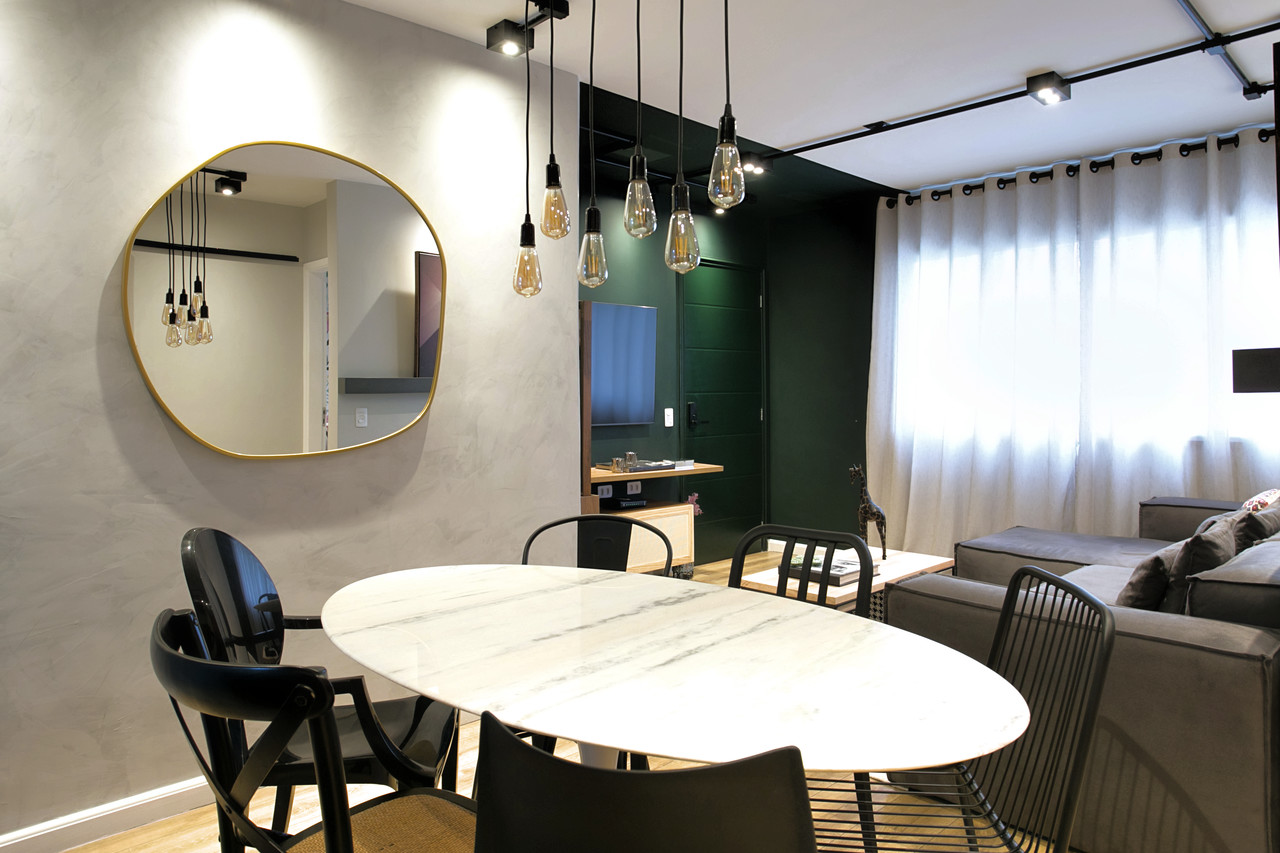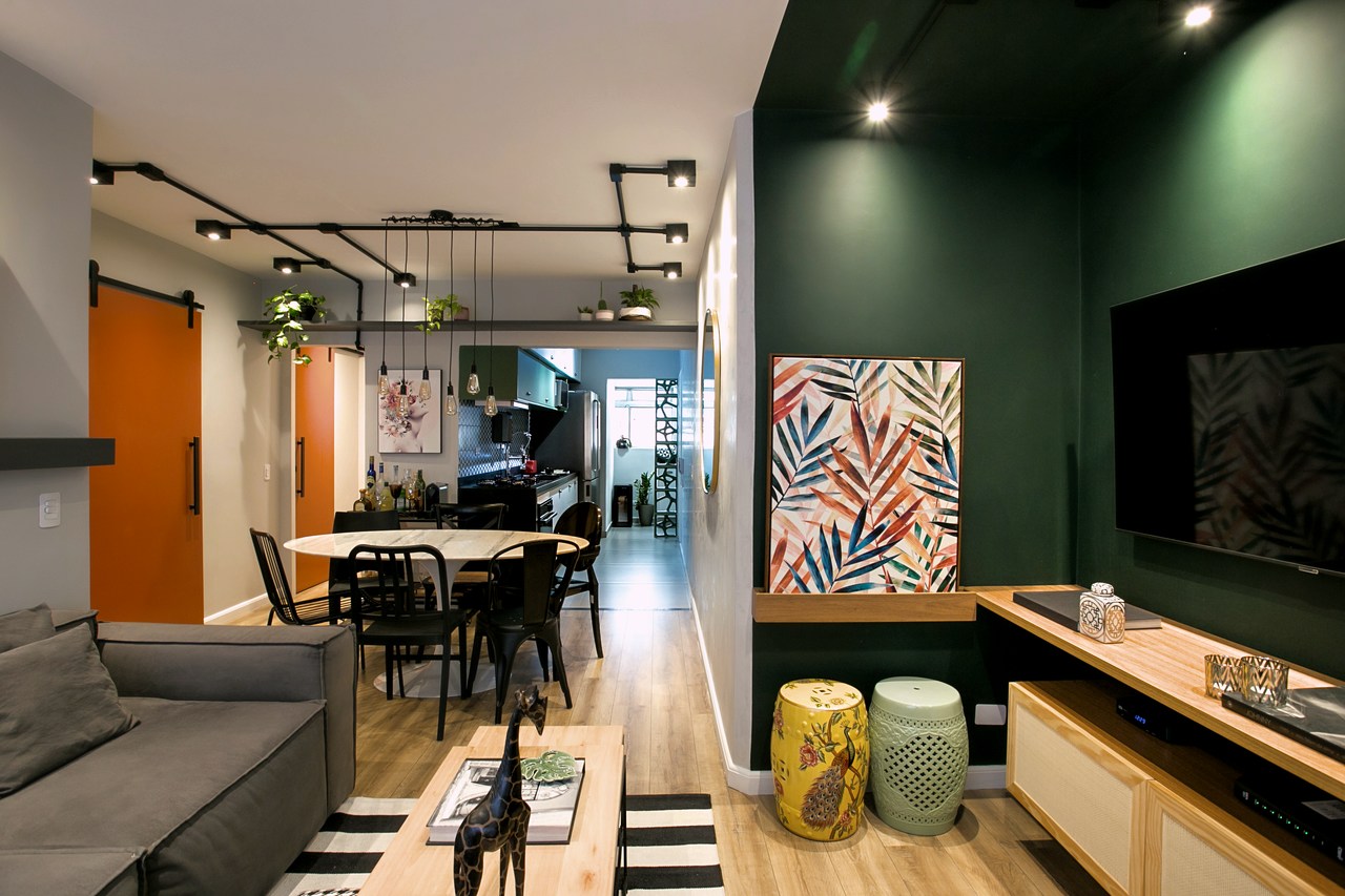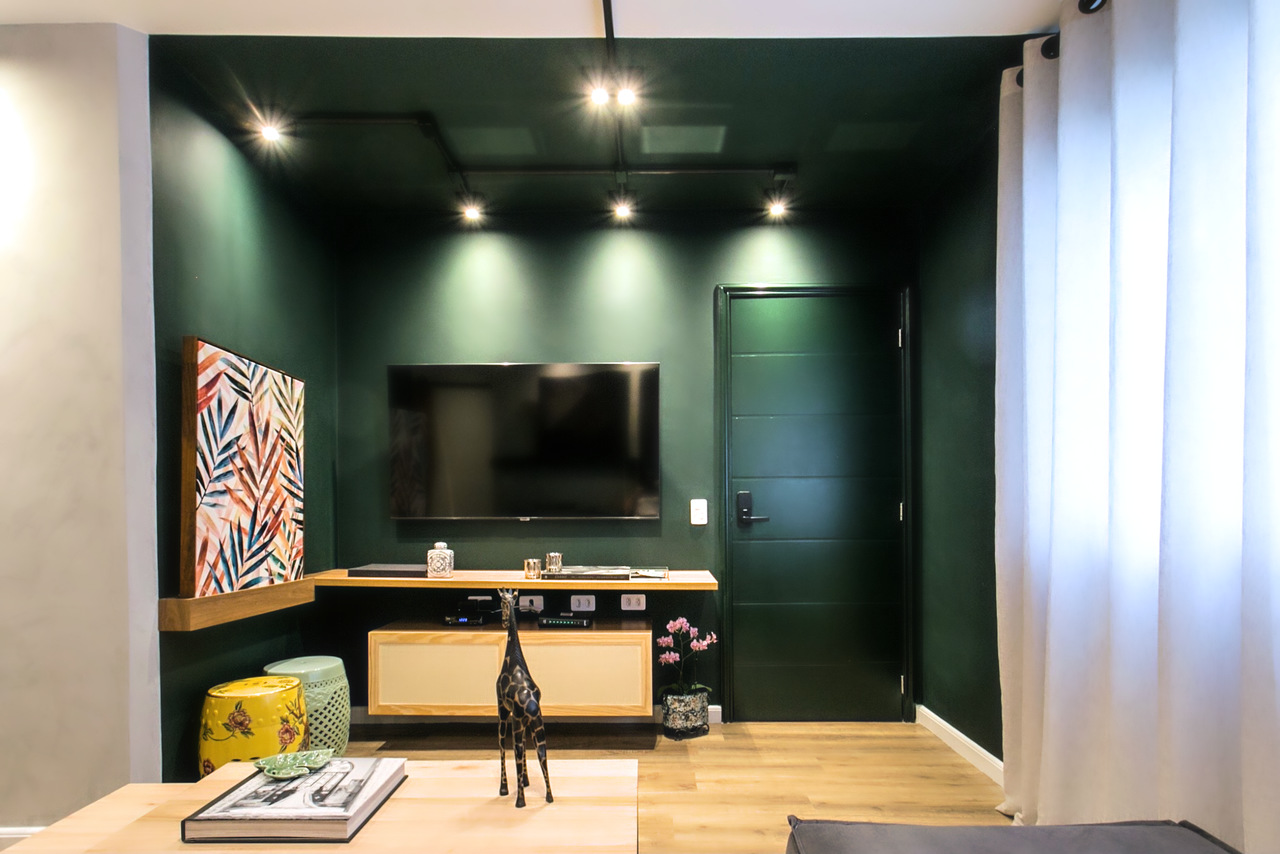 A cor verde traz vida ao apartamento e delimita parte do living, que tem objetos decorativos contemporâneos. O projeto é definido como “Urbano Chic” pela arquiteta