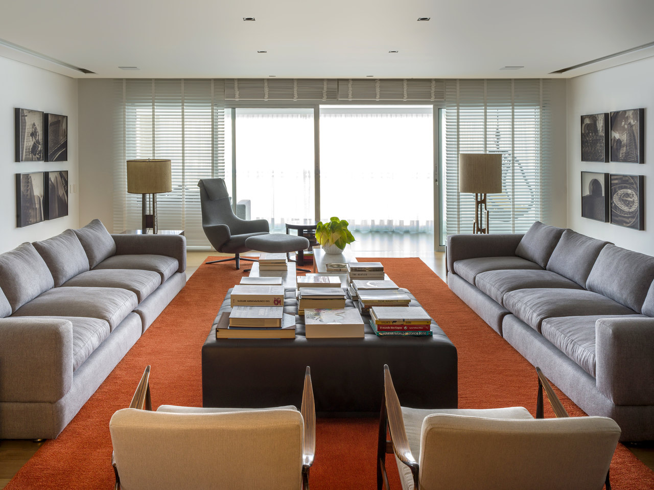 A escultura do artista Cassio Lazaro é um dos pontos altos do estar, junto das poltronas dinamarquesas, ícone do mobiliário modernista brasileiro.