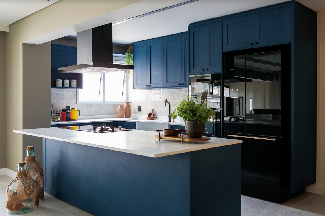 Cheia de vida e com muito estilo, esta cozinha recebeu um projeto baseado nos desejos dos clientes de Orlane Santos: um espaço funcional, leve e alegre para bons momentos em família. Para deixar o ambiente integrado à área social do apartamento, a arquiteta optou pela demolição de uma parede para possibilitar a criação de uma ilha para apoio e cooktop. O grande destaque é a marcenaria inspirada no estilo provençal com a cor azul, escolha certa para deixar o ambiente único. Para equilibrar o tom escuro dos armários, e também dos eletrodomésticos pretos, as bancadas e pia foram revestidas em Corian, material resistente e antibacteriano. Na pia esculpida, a arquiteta optou por uma calha úmida e lixeira embutida, tudo pensado para a funcionalidade do dia a dia da família.