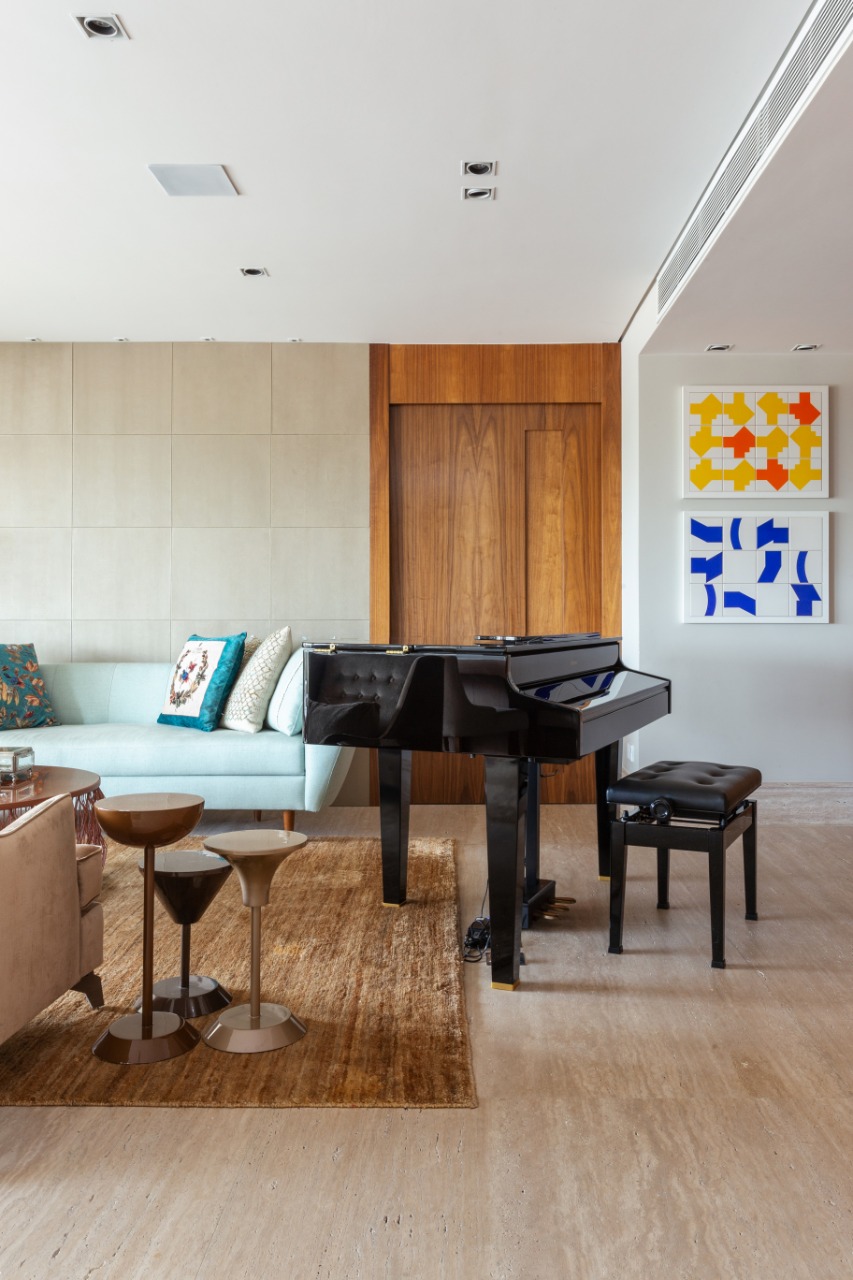 Mais que um instrumento musical, o piano torna-se parte do décor. Além disso, logo ao lado na parede podemos observar os painéis de ladrilho hidráulico que trazem um toque a mais de cor. Cada peça é escolhida de acordo com os gostos dos moradores. Projeto: Dantas & Passos Arquitetura