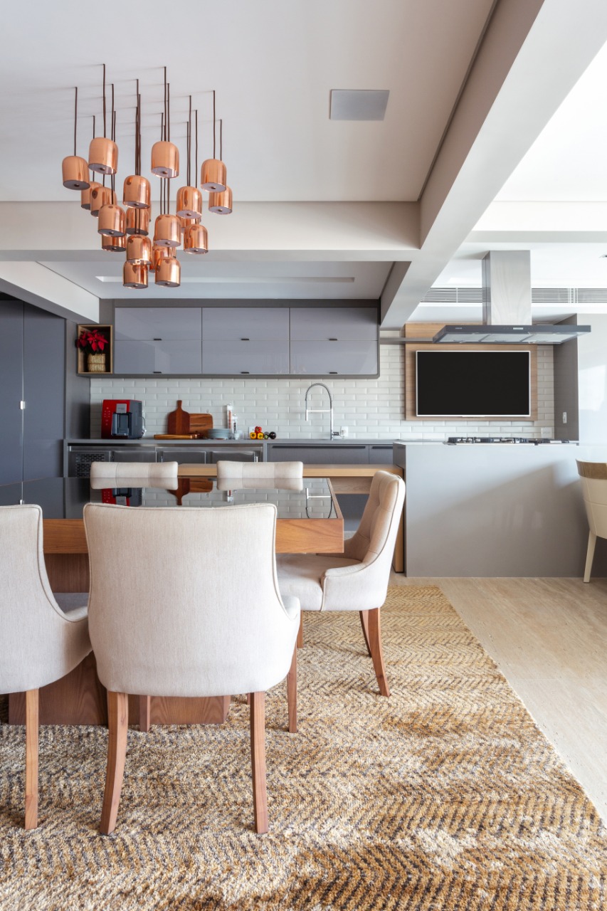Para esse ambiente com integração total das áreas, decidimos trabalhar com uma paleta de cores neutra com destaque para a cor cinza e para contrastar sem tirar a harmonia optamos por um conjunto de pendentes no tom cobre, que trouxe elegância ao espaço. Projeto: Dantas & Passos Arquitetura