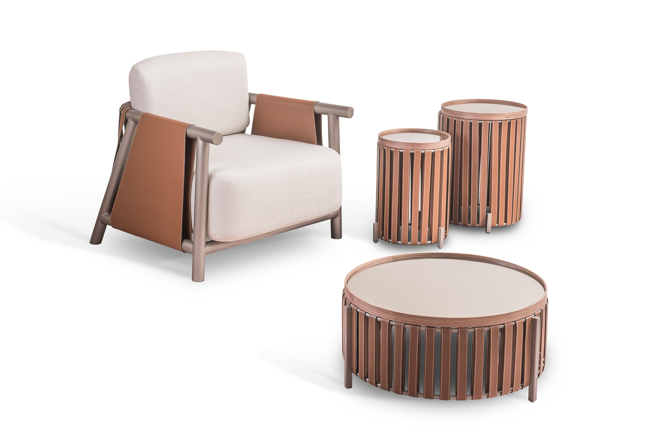 Para compor o conjunto, a linha oferece mesas de centro e laterais, que também buscam elementos da natureza assim como detalhes de alta costura. “As faixas de couro enaltecem a alta costura, da mesma forma que um jogo de cheio e vazado trazem equilíbrio e leveza para o design”, explica Debora.