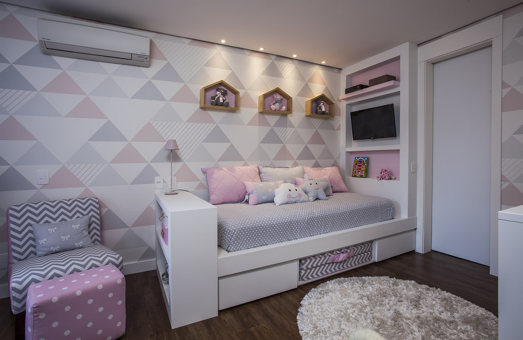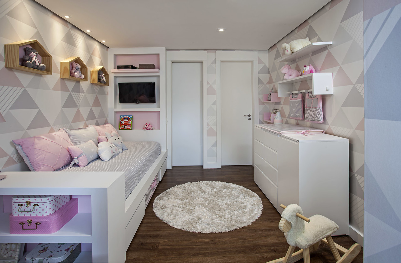 No quarto de bebê, Giselle Macedo e Patricia Covolo investiram por um papel de parede nas cores rosa e lilás em tons pastel com o intuito de oferecer aconchego e tranquilidade