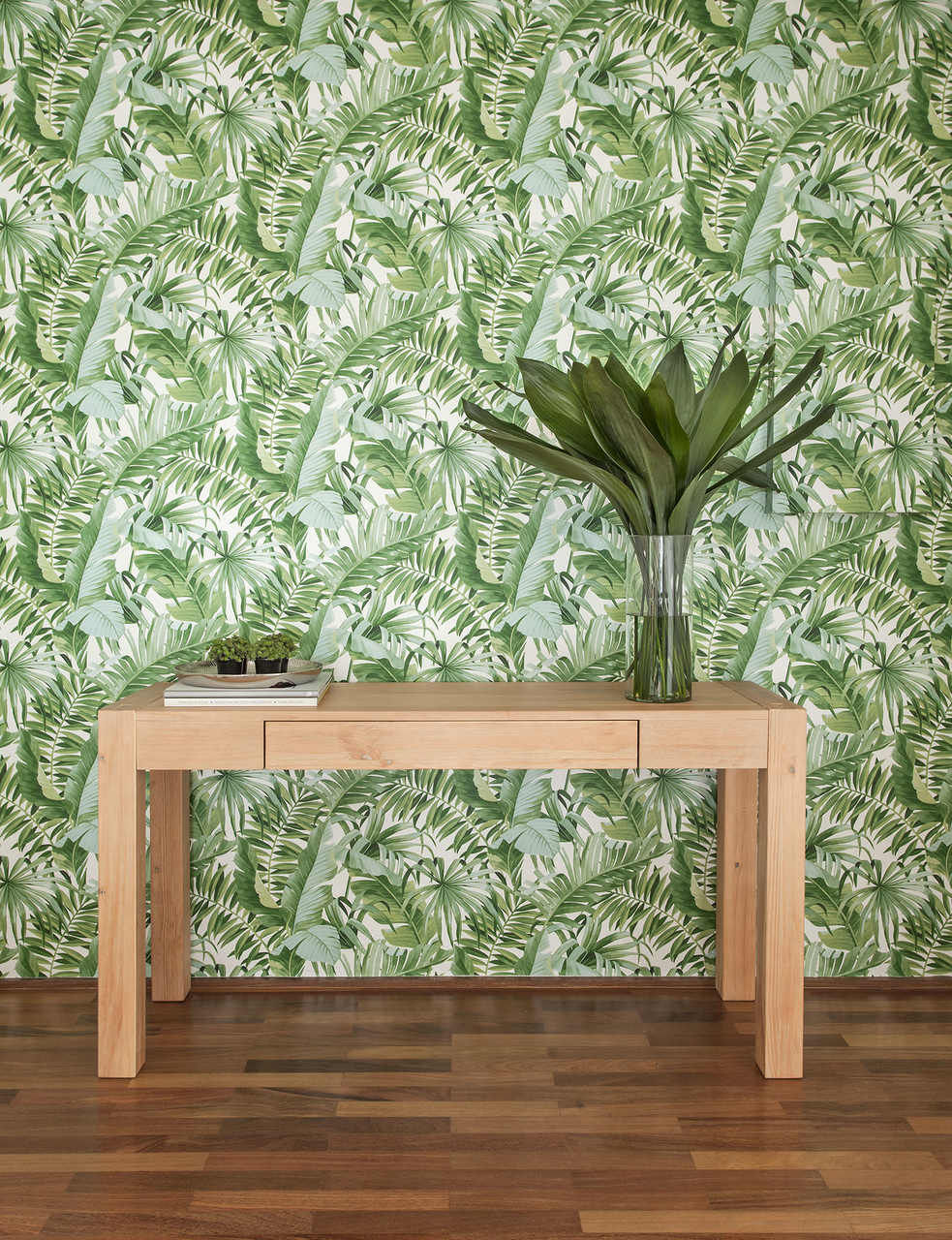 A intensidade do papel de parede com o verde das folhagens trouxe vida e uma identidade singular ao hall de entrada. No complemento, as arquitetas Giselle Macedo e Patricia Covolo apostaram no aparador com madeira clara e um arranjo com folhas