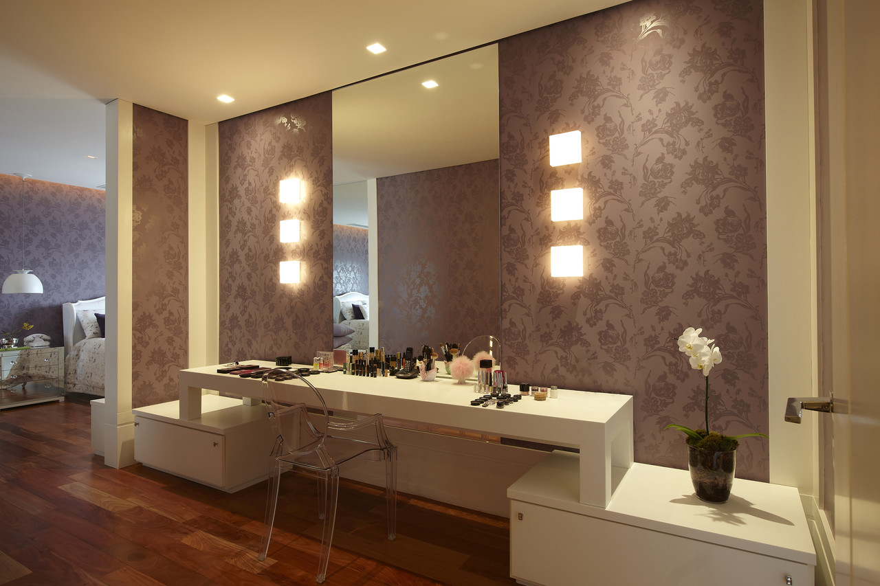 A ideia era que cantinho de maquiagem do quarto da jovem tivesse a cara de um camarim, por isso nesse projeto as arquitetas optaram por um sofisticado papel de parede de flores