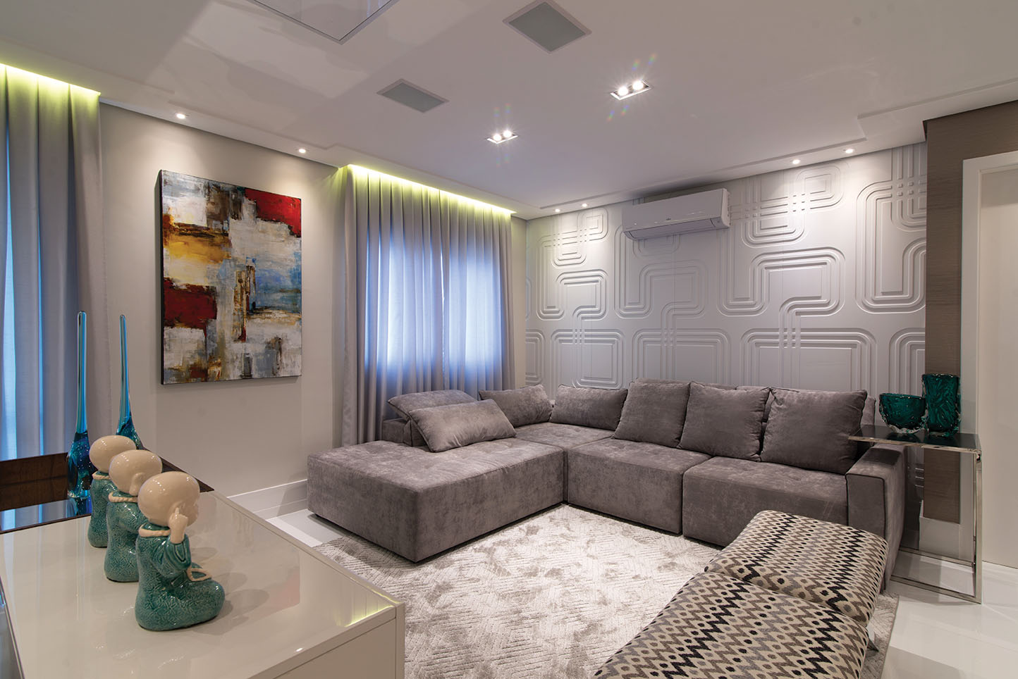 Após decidir repaginar o apartamento de 160 m2 localizado no Tatuapé, o casal com dois filhos pequenos recorreu à arquiteta Sueli Vieira para dar ao imóvel um toque pessoal. “Sempre de olho no conforto e na praticidade de manutenção, criei um projeto moderno com toques sofisticados, cores neutras e revestimentos nobres”, afirma a profissional. A essa atmosfera foram adicionados alguns elementos atemporais, a exemplo do painel em alto relevo projetado pela Mentha Painéis Decorativos – um dos maiores destaques do apartamento, que fez par perfeito com os grandes sofás da V. Mobili, vide foto em destaque no topo da matéria.