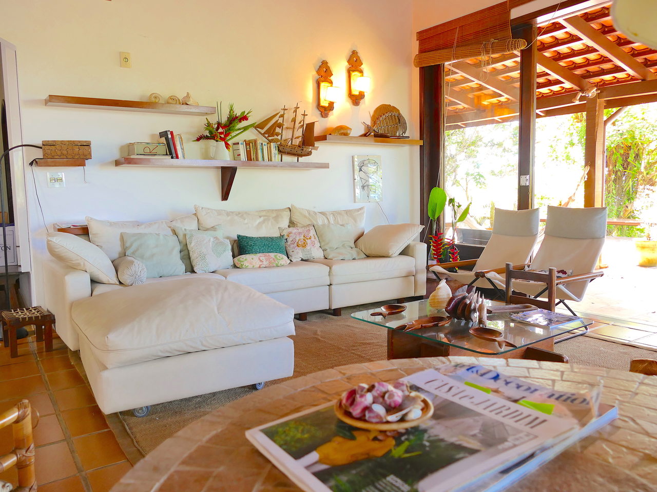 A iluminação natural é fundamental e quanto mais aberturas, melhor! Mas atenção, é preciso prever brises, toldos, cortinas de palha, junco ou pergolados para os horários de incidência direta de sol. E, claro, prever uma boa ventilação natural cruzada. Para casas situadas em locais muito quentes durante todo o ano, portas de madeira divididas em 4 partes servem de janelas e eliminam a necessidade de vidros. É importante prever ganchos para prendê-las, pois rajadas de vento podem não deixá-las abertas. Para iluminação artificial, prefira lâmpadas led de cor amarelada e cúpulas de palha, que além de super charmosas, são geralmente executadas por artesãos locais. Outra dica é criar abajures com garrafas de vidro preenchidos com conchas ou abajures de vime trançado ou madeira.