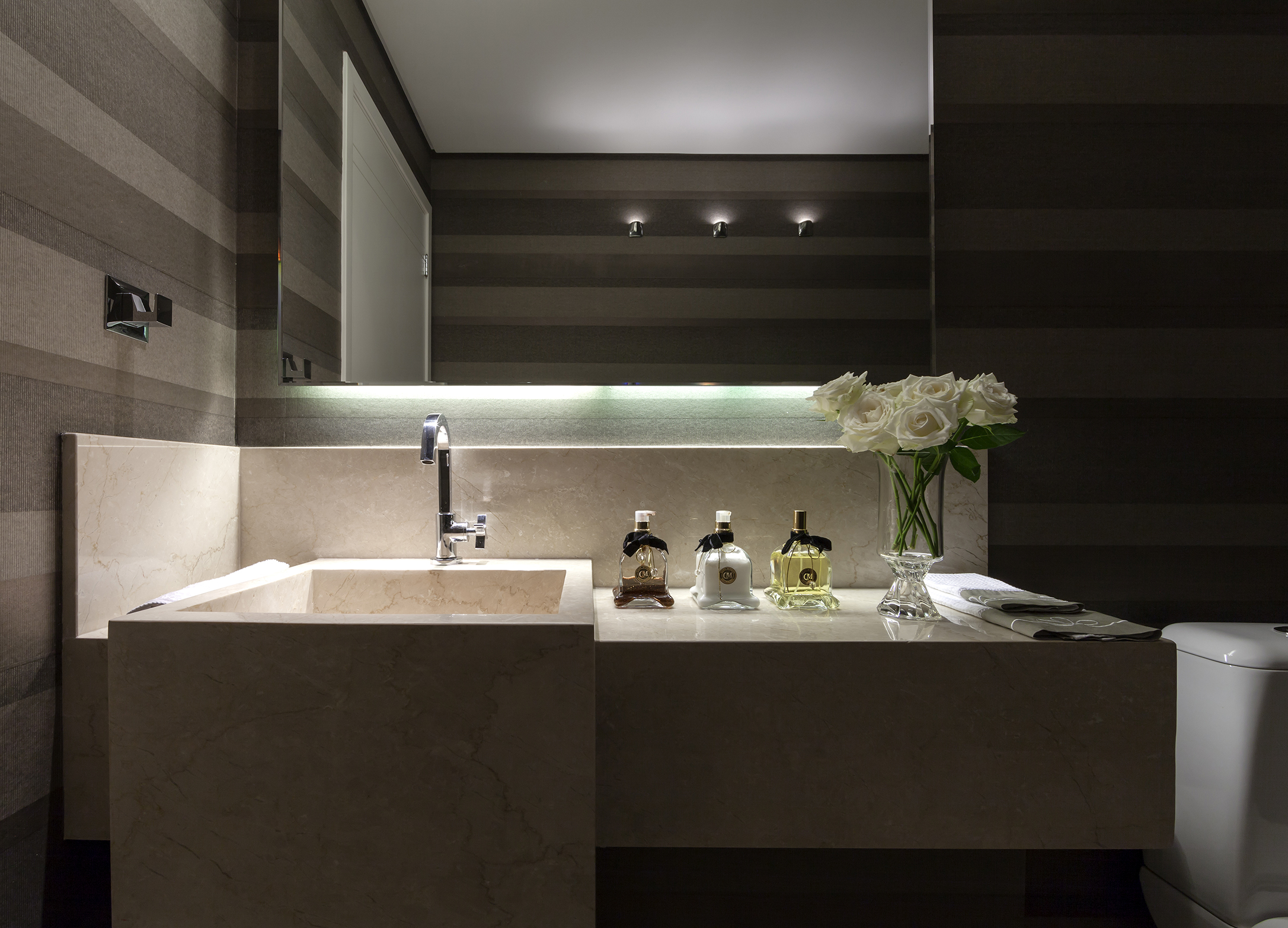 Os lavabos são áreas que, assim como os halls, funcionam como o cartão de visitas de uma casa, portanto, a dica é soltar a criatividade, usar e abusar de cores e caprichar em cada detalhe na décor. Lavabos escuros e com iluminação dramática imprimem personalidade ao espaço, que costumam ter pequenas dimensões.  Nos revestimentos e nas bancadas, a tendência é o uso de pedras rústicas mescladas a madeira, como freijó, carvalho e nogueira que trazem sofisticação, além dos papéis de parede com toque de tecido.