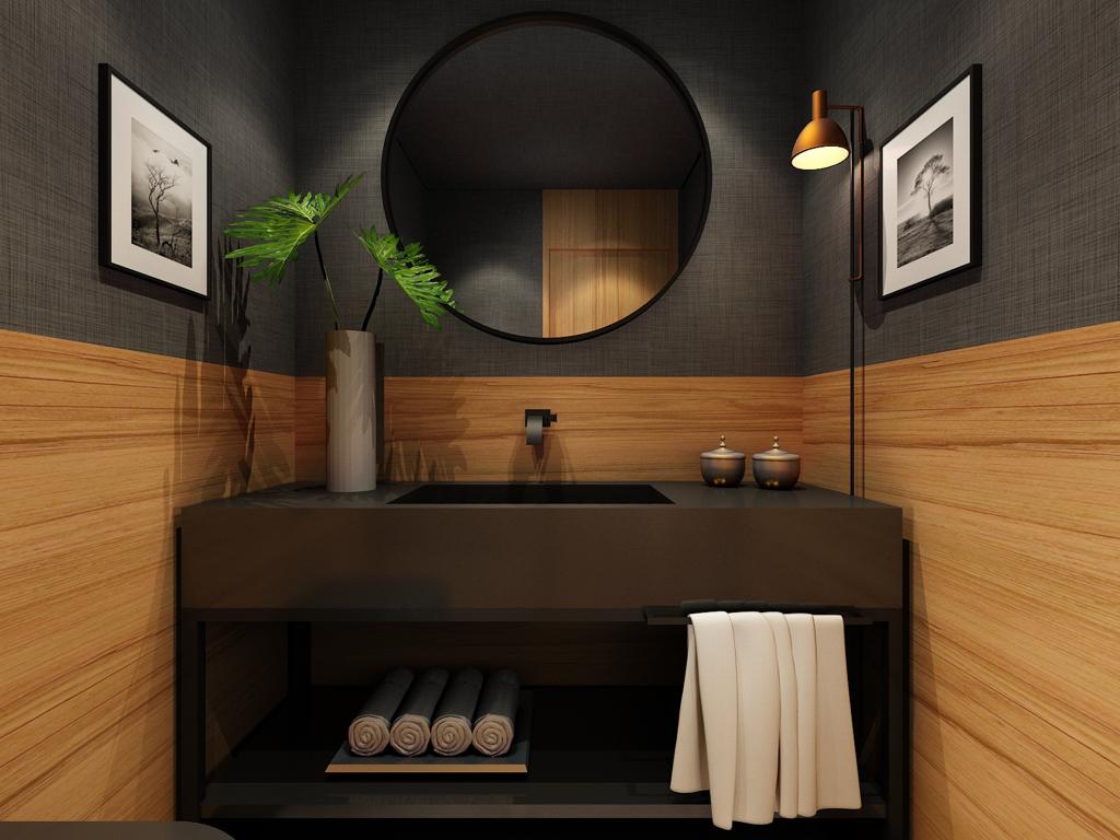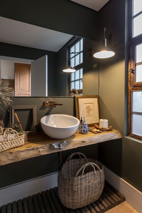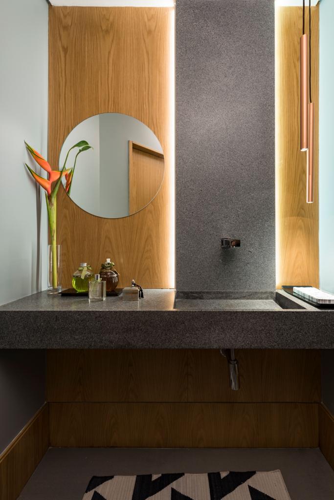 Os lavabos são áreas que, assim como os halls, funcionam como o cartão de visitas de uma casa, portanto, a dica é soltar a criatividade, usar e abusar de cores e caprichar em cada detalhe na décor. Lavabos escuros e com iluminação dramática imprimem personalidade ao espaço, que costumam ter pequenas dimensões.  Nos revestimentos e nas bancadas, a tendência é o uso de pedras rústicas mescladas a madeira, como freijó, carvalho e nogueira que trazem sofisticação, além dos papéis de parede com toque de tecido.