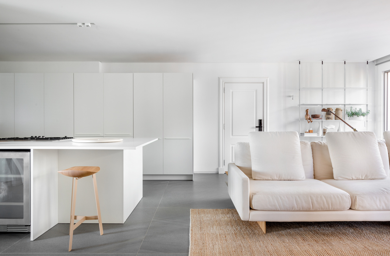 A cozinha, localizada na sala, foi projetada para ser discreta e funcional, com eletrodomésticos embutidos que não interferem na área social. A marcenaria foi utilizada de forma mínima, atendendo apenas às necessidades funcionais do lar, como o brise de madeira na sala, que minimiza a incidência da luz solar da tarde e aumenta a privacidade do ambiente.