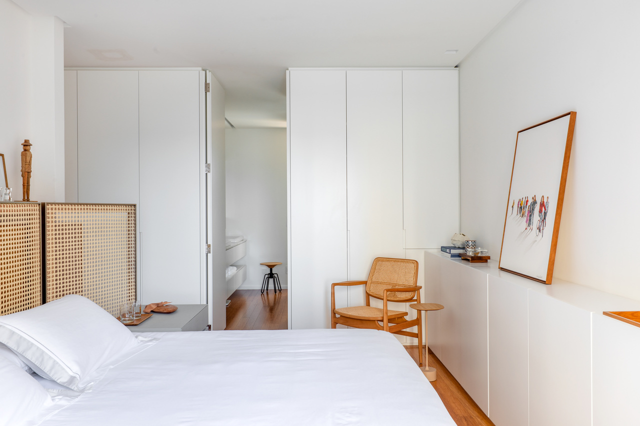 No quarto do casal, que também tem vista para o terraço, o destaque é a cabeceira de palhinha, que trouxe um toque natural ao ambiente.