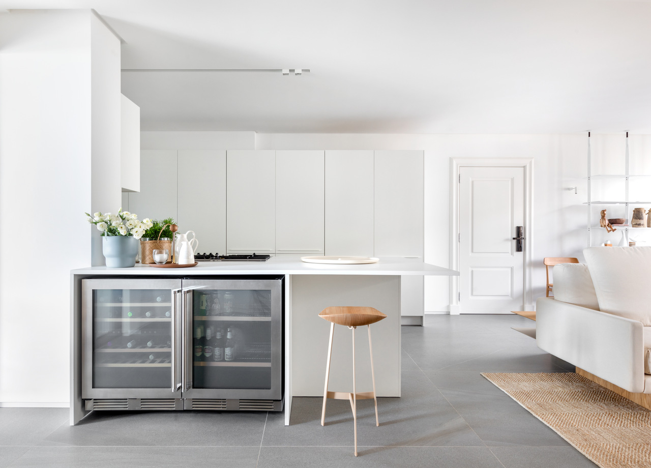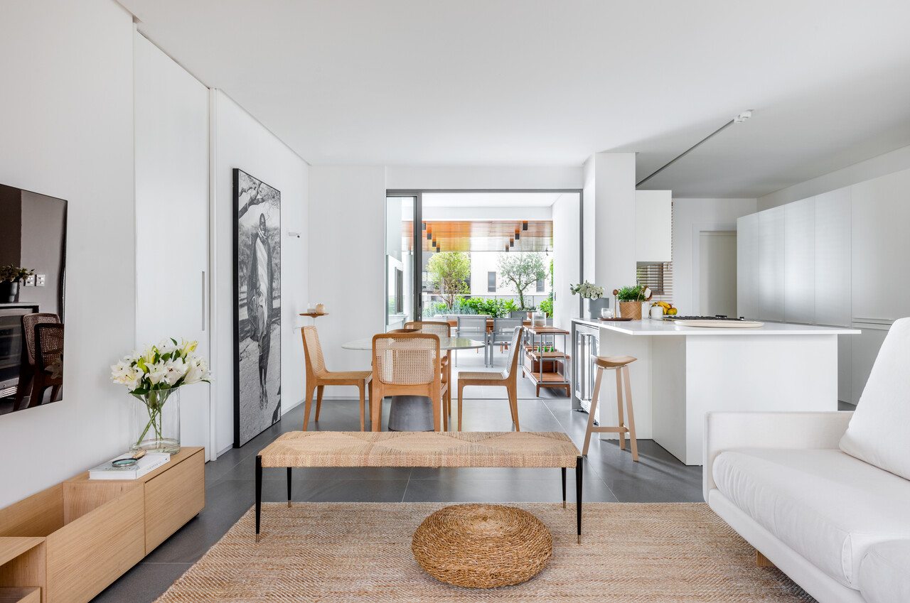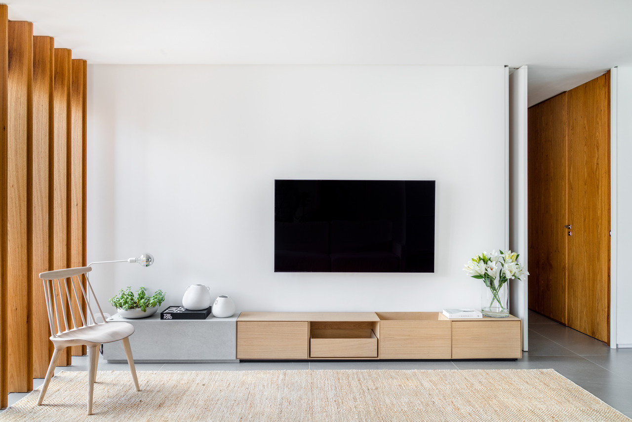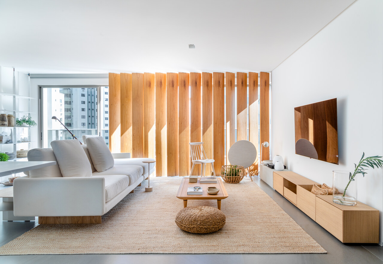 A cozinha, localizada na sala, foi projetada para ser discreta e funcional, com eletrodomésticos embutidos que não interferem na área social. A marcenaria foi utilizada de forma mínima, atendendo apenas às necessidades funcionais do lar, como o brise de madeira na sala, que minimiza a incidência da luz solar da tarde e aumenta a privacidade do ambiente.