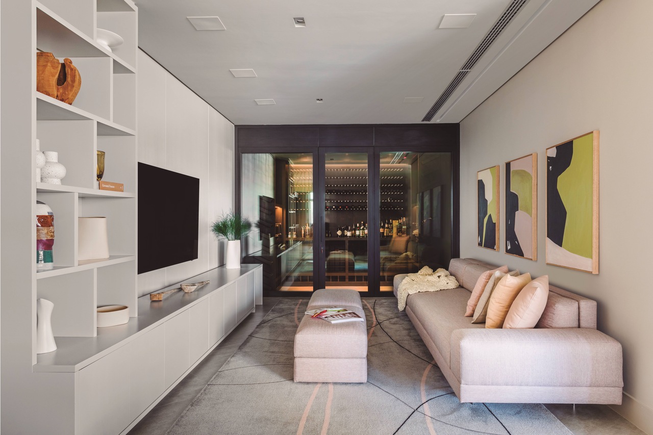 O ponto alto do projeto consiste no living, onde a criatividade de Andrea brilhou. O desejo dos clientes por uma adega no apartamento foi atendido de maneira única, com a integração deste espaço ao home-theater. O resultado: um layout fluído, amplo espaço de circulação e uma espetacular vista de 360° da cidade de São Paulo. A cozinha, antes angular, passou por transformações significativas.