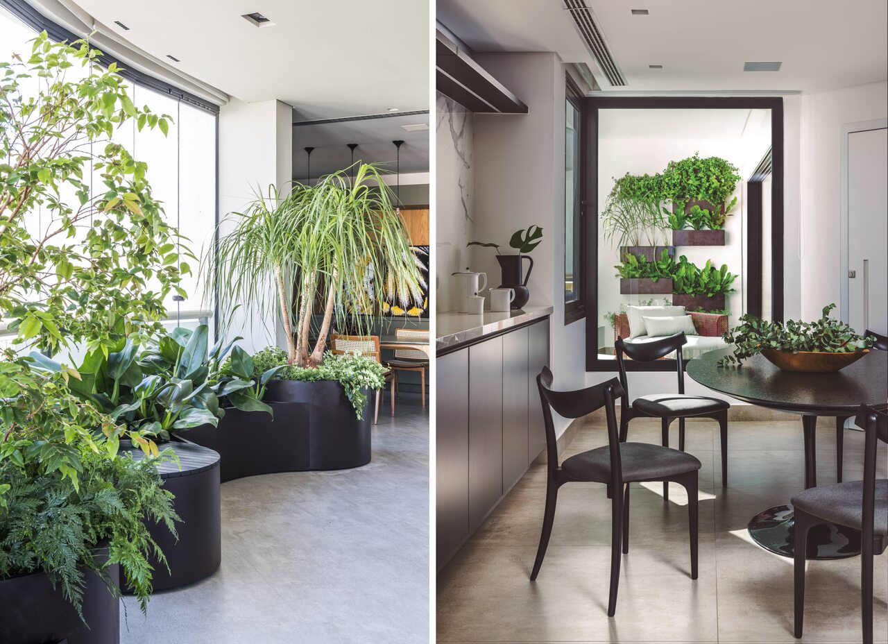 O desafio foi a disposição cuidadosa do mobiliário para não comprometer a circulação. Foi executada uma ilha, que funciona também como um ponto de cor, e uma copa com mesa redonda para quatro cadeiras. O paisagismo, assinado por Ricardo Pessuto, segue as linhas curvas da arquitetura do prédio. Uma horta vertical, em floreiras harmonizadas com a poltrona Dondo, de Jean-Marie Massaud, traz espécies aromáticas que invadem os interiores, carregados de design e arte.