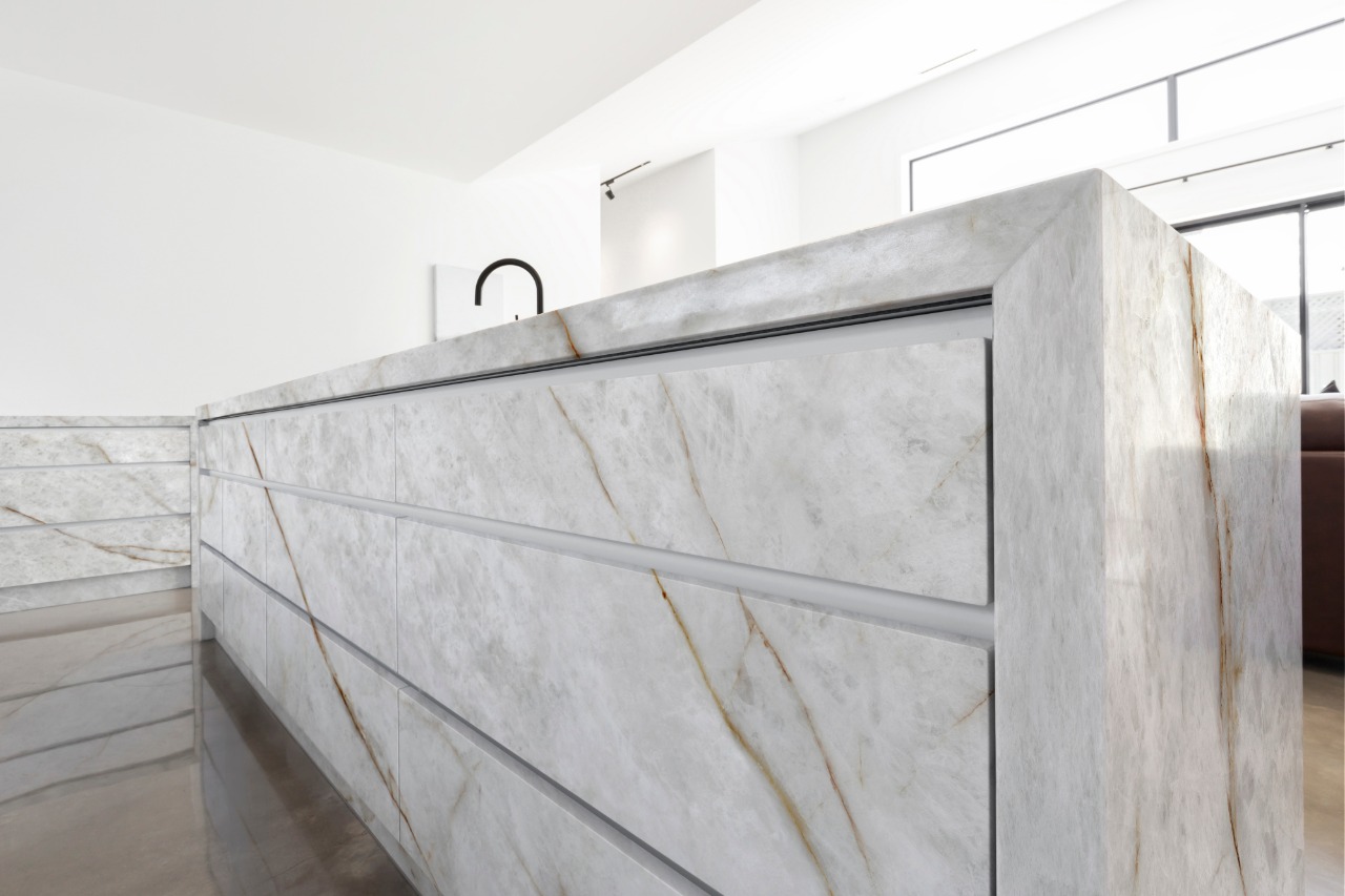 Neolith Himalaya Cristal | Esse modelo, em acabamentos Décor Polished e Ultrasoft, presta homenagem aos cristais de sal da região do Himalaia. As veias dão toque de autenticidade. Com aparência limpa e cristalina, deixa os ambientes elegantes.