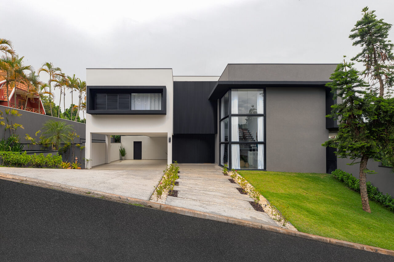 Projetada para uma família em busca de um refúgio tranquilo, esta residência de 488 m² na Granja Viana une sofisticação e funcionalidade. O projeto foi desenvolvido a partir de um terreno com desnível, cuja solução arquitetônica evitou múltiplos andares, mantendo a casa com dois níveis e respeitando a vegetação já existente.