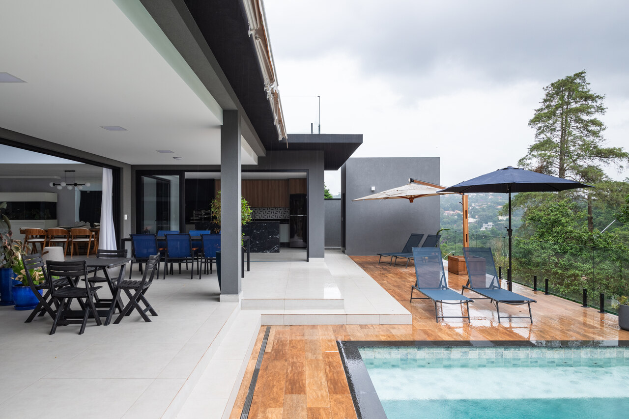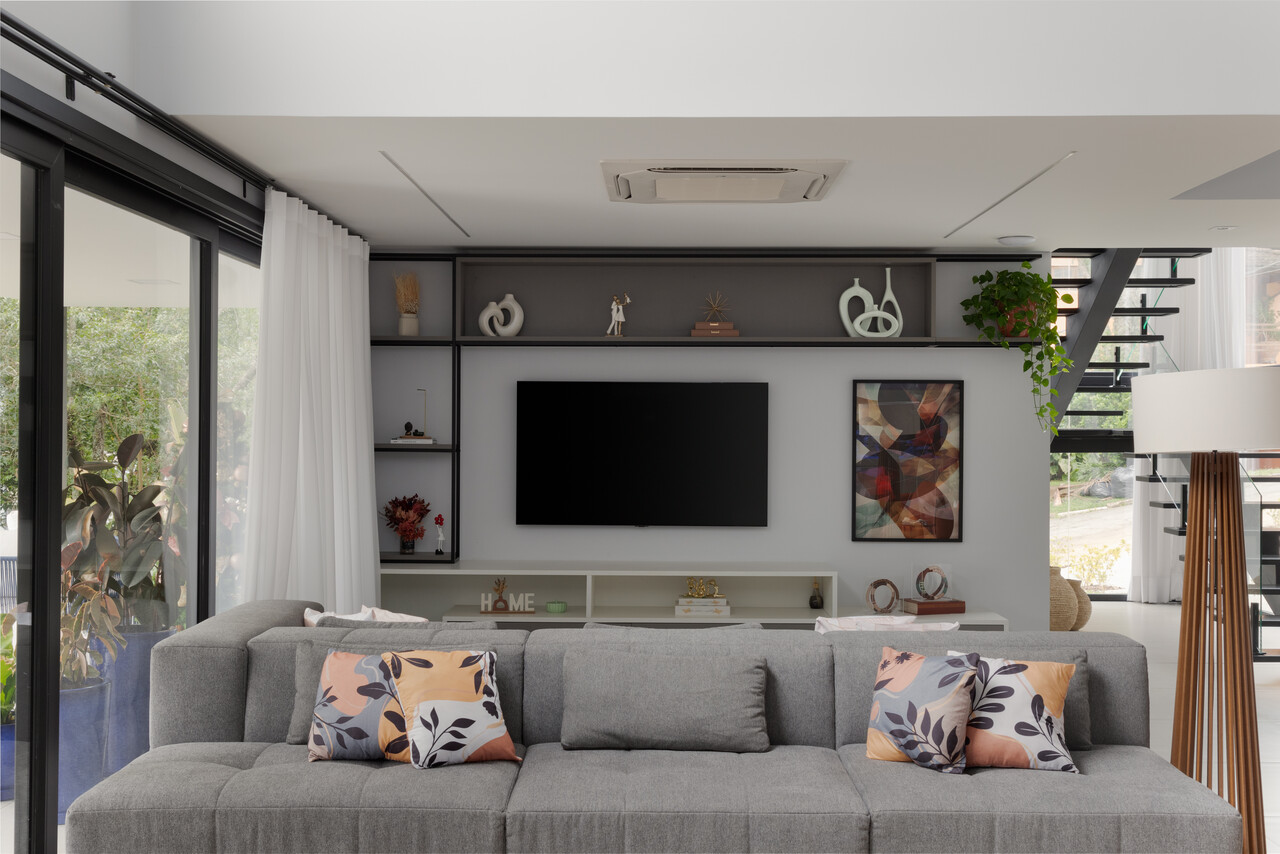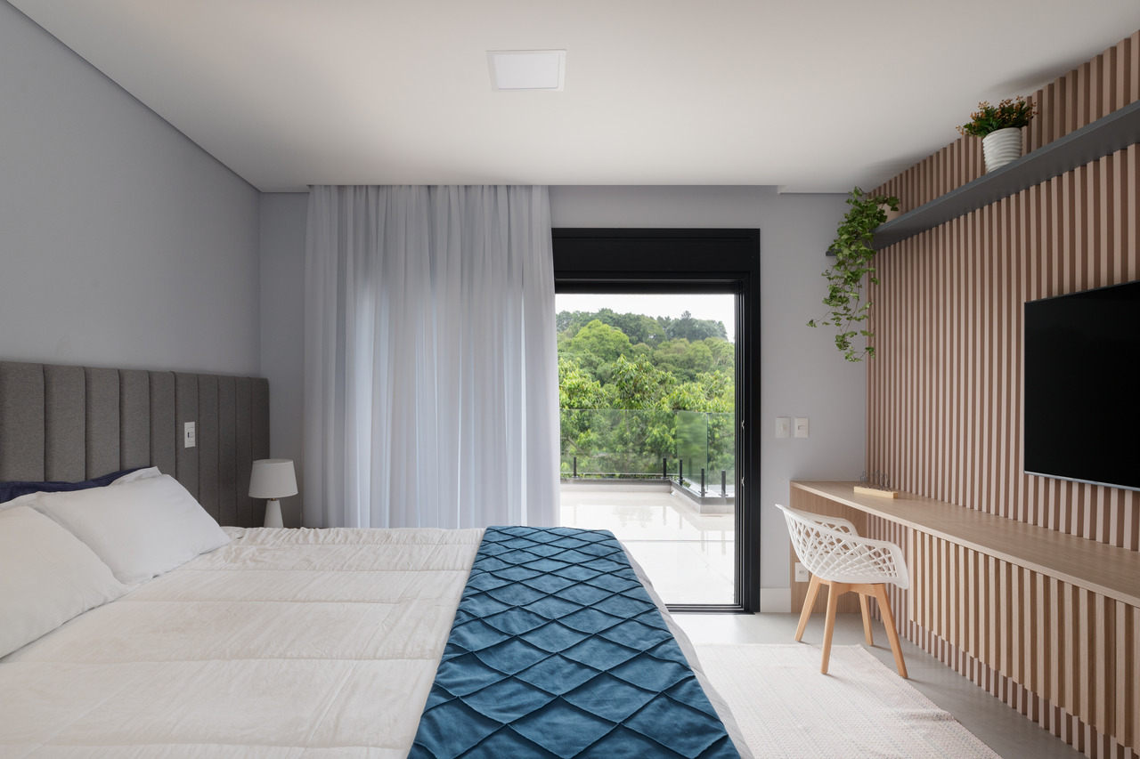 A integração entre interior e exterior foi o fio condutor do projeto. A sala central, com pé-direito duplo, tornou-se o coração da casa, conectando visualmente os ambientes sociais e favorecendo a entrada de luz natural em abundância. Além disso, espaços como o home office, projetado com vista para o verde, reforçam a harmonia entre a arquitetura e o entorno.