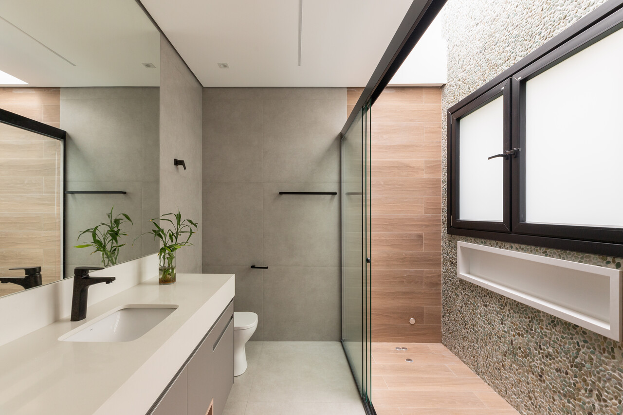 A fachada combina elementos como tinta de diferentes tonalidades e ripados de PVC preto, que destacam a entrada principal. O uso estratégico de materiais enfatiza uma estética contemporânea, enquanto os interiores se caracterizam por marcenaria planejada, porcelanatos e móveis que equilibram funcionalidade e sofisticação. O projeto também incorpora soluções sustentáveis, como reuso de água da chuva, aquecimento solar e ventilação cruzada, reforçando o compromisso com o meio ambiente e a eficiência energética.