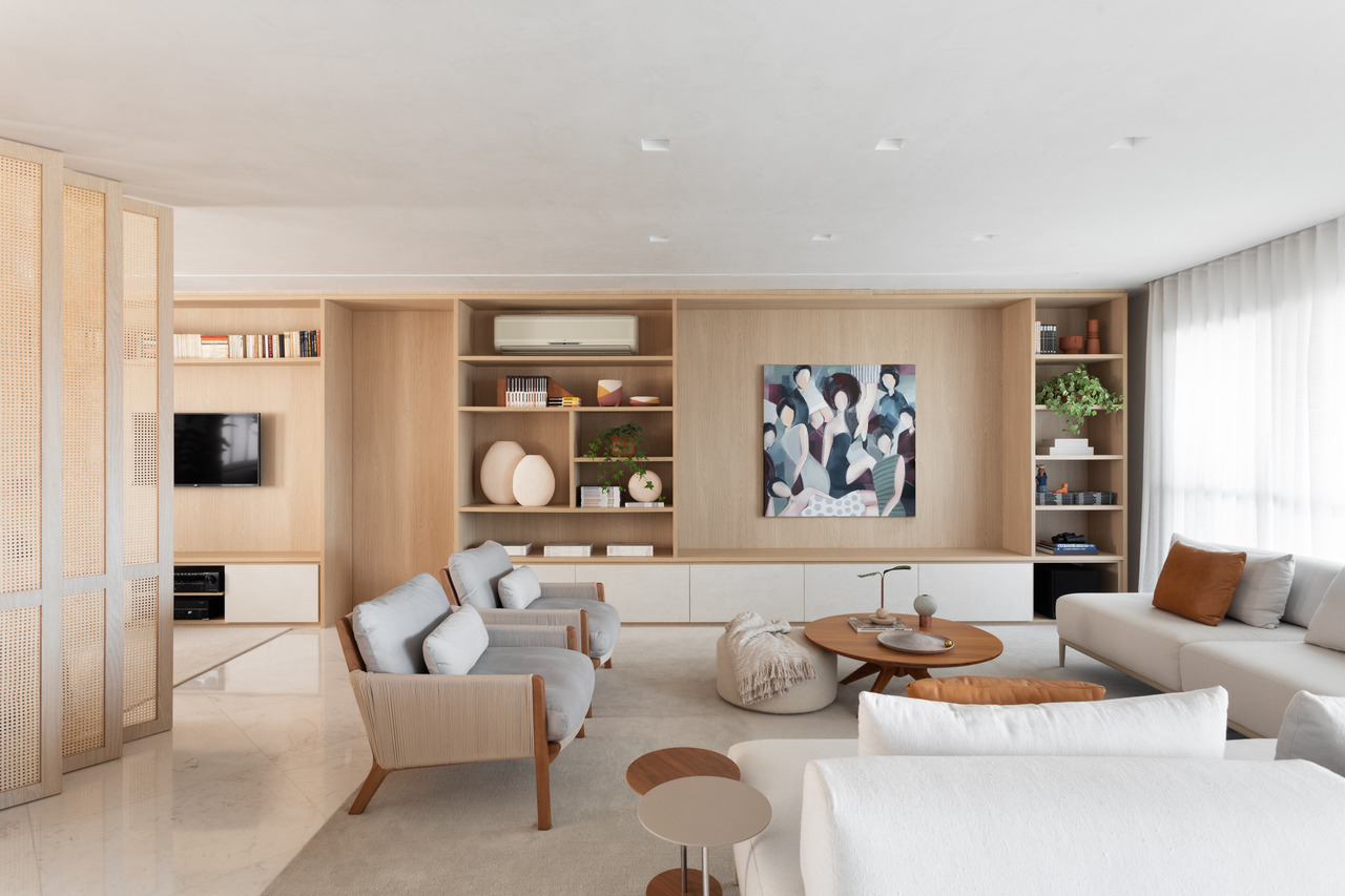 A área social foi completamente repaginada para se adequar ao lifestyle da família. Salas de estar e jantar foram integradas e a iluminação repensada afim de equilibrar a luminosidade natural e a artificial, sem perder a privacidade da área destinada a sala de TV, que recebeu um painel de Muxarabi e uma marcenaria que envelopa toda a extensão do living para acomodar a coleção de livros do casal, peças de design e obras de arte.