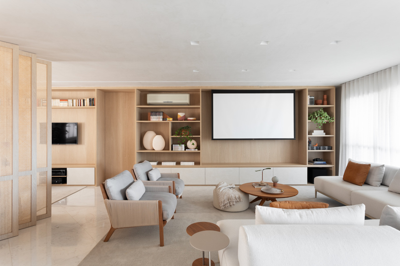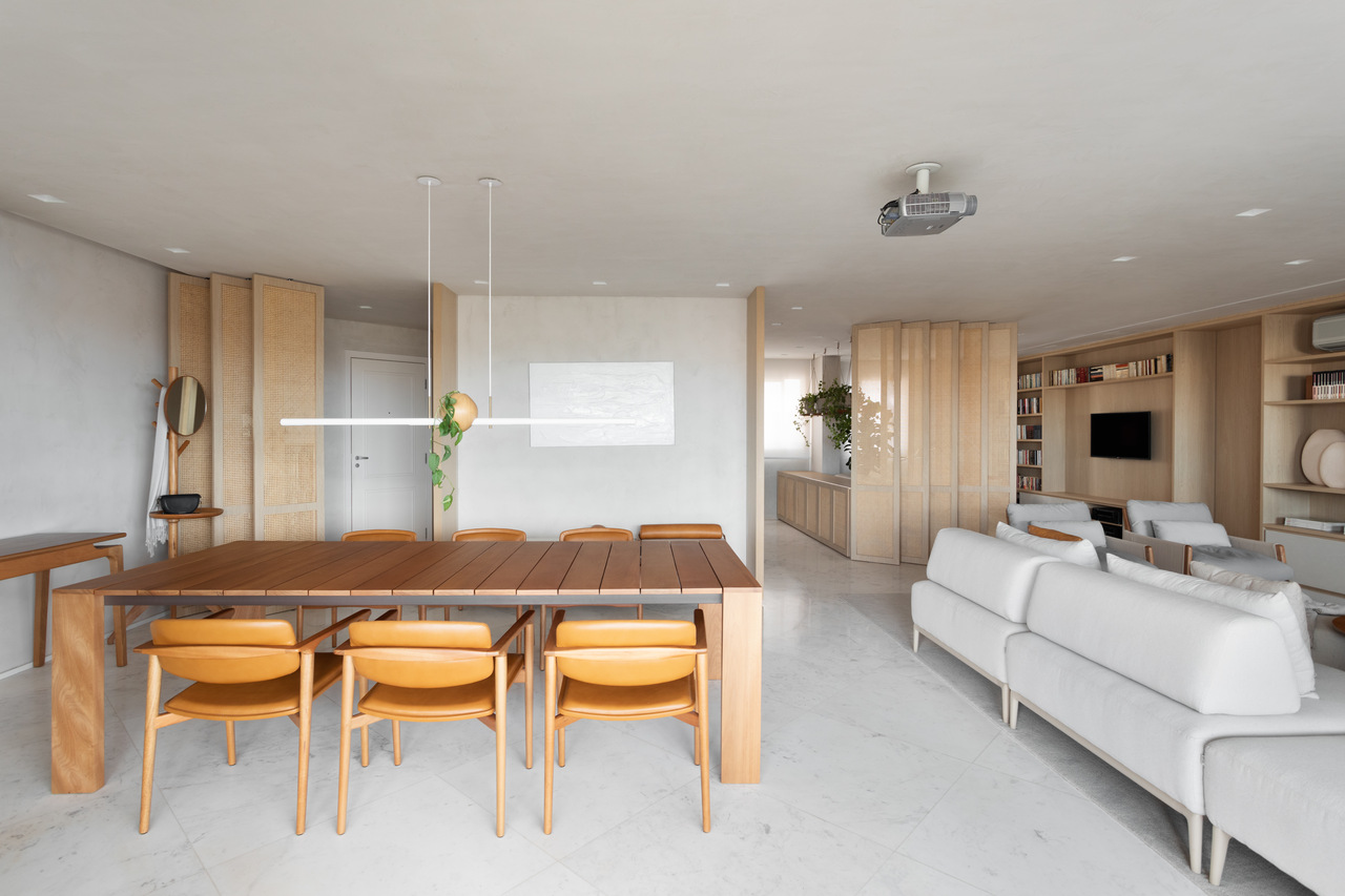 A área social foi completamente repaginada para se adequar ao lifestyle da família. Salas de estar e jantar foram integradas e a iluminação repensada afim de equilibrar a luminosidade natural e a artificial, sem perder a privacidade da área destinada a sala de TV, que recebeu um painel de Muxarabi e uma marcenaria que envelopa toda a extensão do living para acomodar a coleção de livros do casal, peças de design e obras de arte.