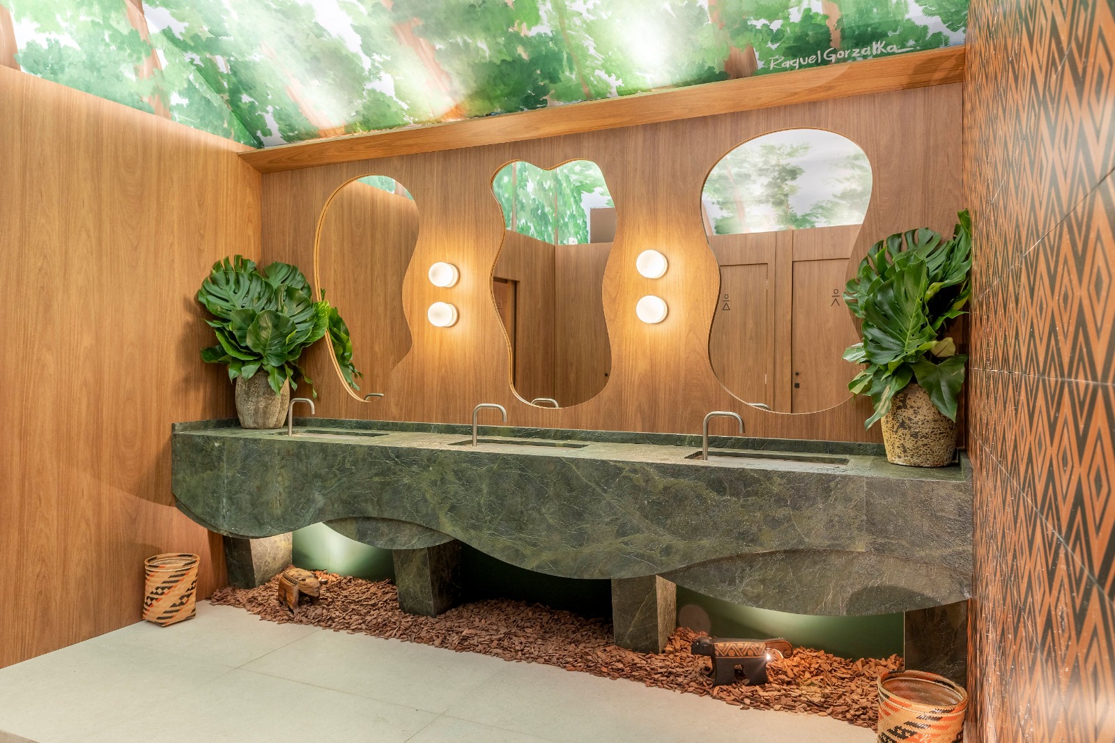 Além do quartzito, o ambiente inclui madeira Jatobá, que remete aos troncos das árvores amazônicas, e ladrilhos hidráulicos na parede, que representam grafismos indígenas. Esses elementos são complementados por outras escolhas de design que visam proporcionar uma experiência sensorial completa, evocando a floresta e destacando a importância da preservação ambiental.