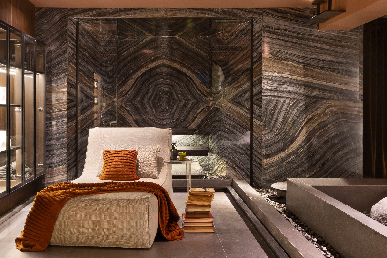 casados como ponto focal da sauna. Para esse efeito, foi eleito o mármore Silver Wave, da VM Stone, com beneficiamento da marmoraria Pedra Única. O material tece uma narrativa de elegância e serenidade e oferece uma experiência sensorial, imbuída da percepção de profundidade, habilmente evocada pelos sinuosos veios do mármore, que se entrelaçam em um jogo de tons de cinza, do claro ao escuro, em ondulações e ondas envolventes. A pedra, com seus padrões líquidos, confere ao ambiente uma sensação de movimento fluido, elevando a experiência a um novo patamar de refinamento e contemplação.