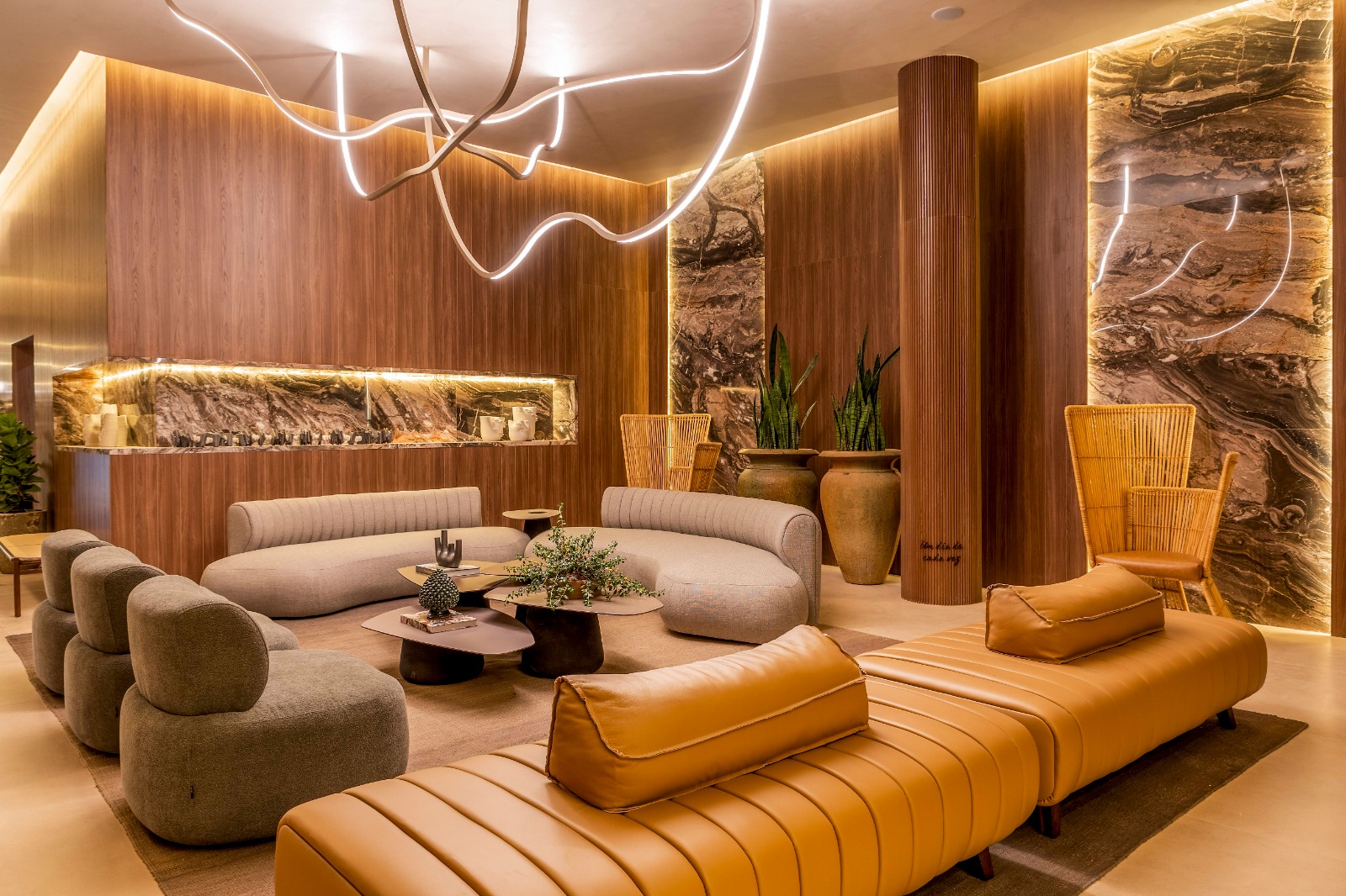 No “Espaço Zenith”, os arquitetos Pedro Alves, Ana Brandão e Amanda Zillig Arquitetos, trouxeram o conceito de excelência no cuidado pessoal. O projeto celebra a harmonia dos elementos naturais e traz um grande “olho” de veios