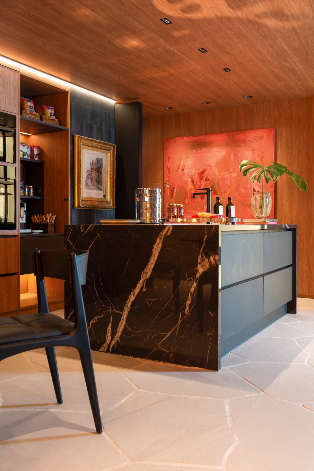 O projeto assinado pela Moreira do Valle Arquitetura abrange living, cozinha, lavanderia, banheiro e dormitório com closet e varanda, totalizando 113 m². O revestimento XTONE Marquina Black Polido, fornecido pela VM Stone com parceria de execução com a Edgran, compõe a bancada da cozinha, da lavanderia e do banheiro, conferindo ainda mais elegância atemporal ao ambiente. A grande ilha que compõe o espaço reflete sofisticação com suas cores sóbrias e elegantes. O material, com fundo preto e veios brancos, cria uma atmosfera clássica para o intitulado “Loft do Jovem Executivo”. Marquina Black Polido apresenta um design que evoca a escuridão da noite entrelaçada com finos veios brancos, iluminando a superfície e combinando simplicidade e sofisticação de maneira única.