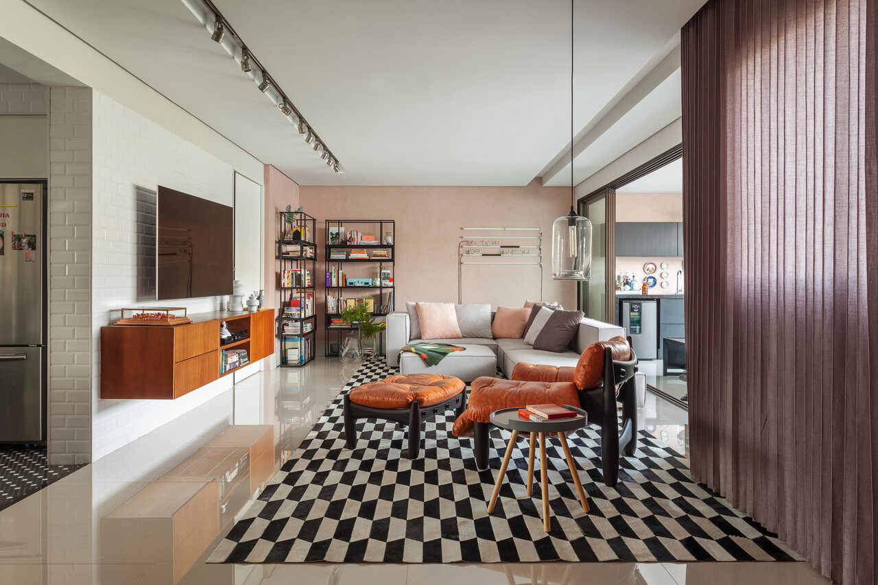As clientes, quando adquiriram este apartamento, tinham em mente algumas referências. Uma delas, a cor rosa, a outra era ter um lar inspirado nos lofts nova-iorquinos. Lila trabalha no setor de tecnologia e Mariana na área de publicidade, e juntas desejavam transformar um apartamento de 4 quartos em um loft, para ter mais espaço, para ambas e um casal de cachorrinhos. Quem assina o projeto de interiores é a arquiteta Marina Dubal, da Dubal Arquitetura e Design.