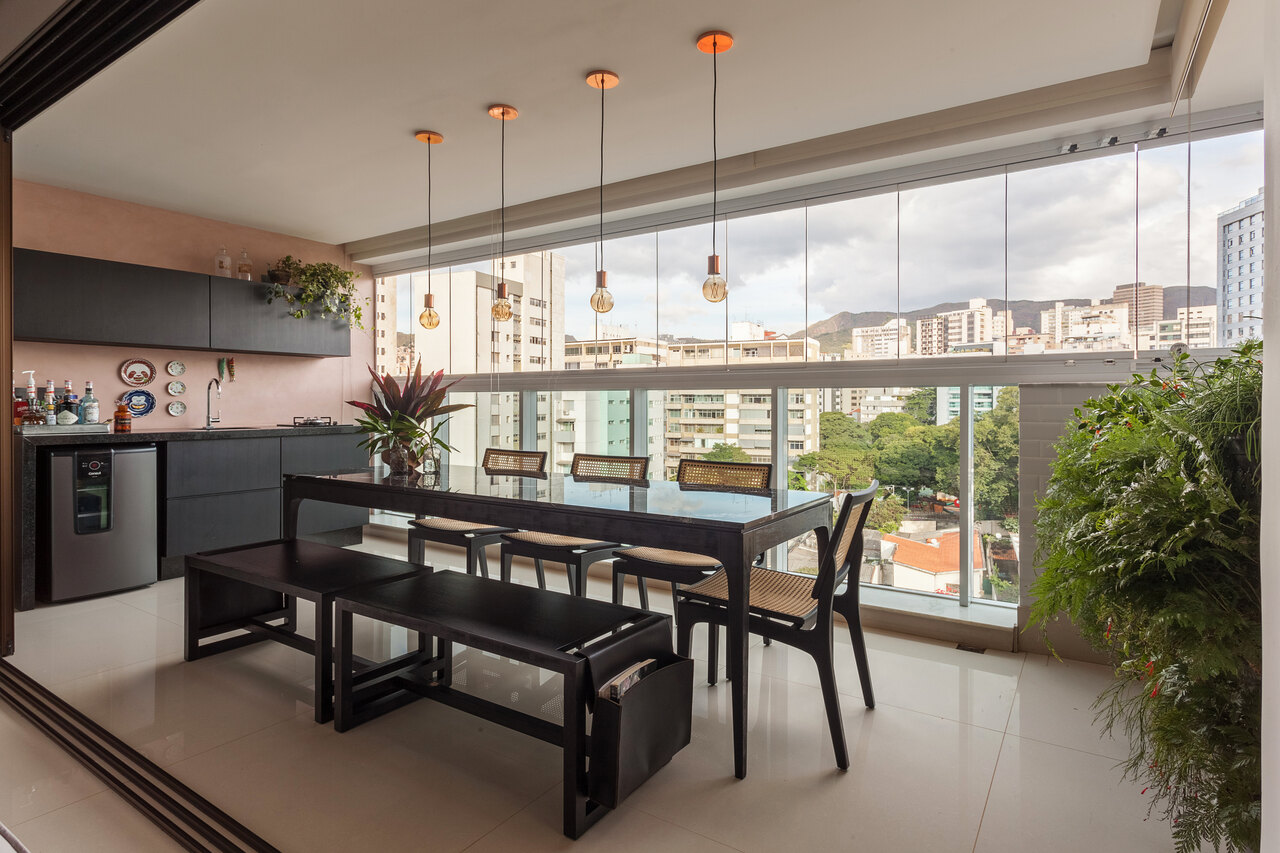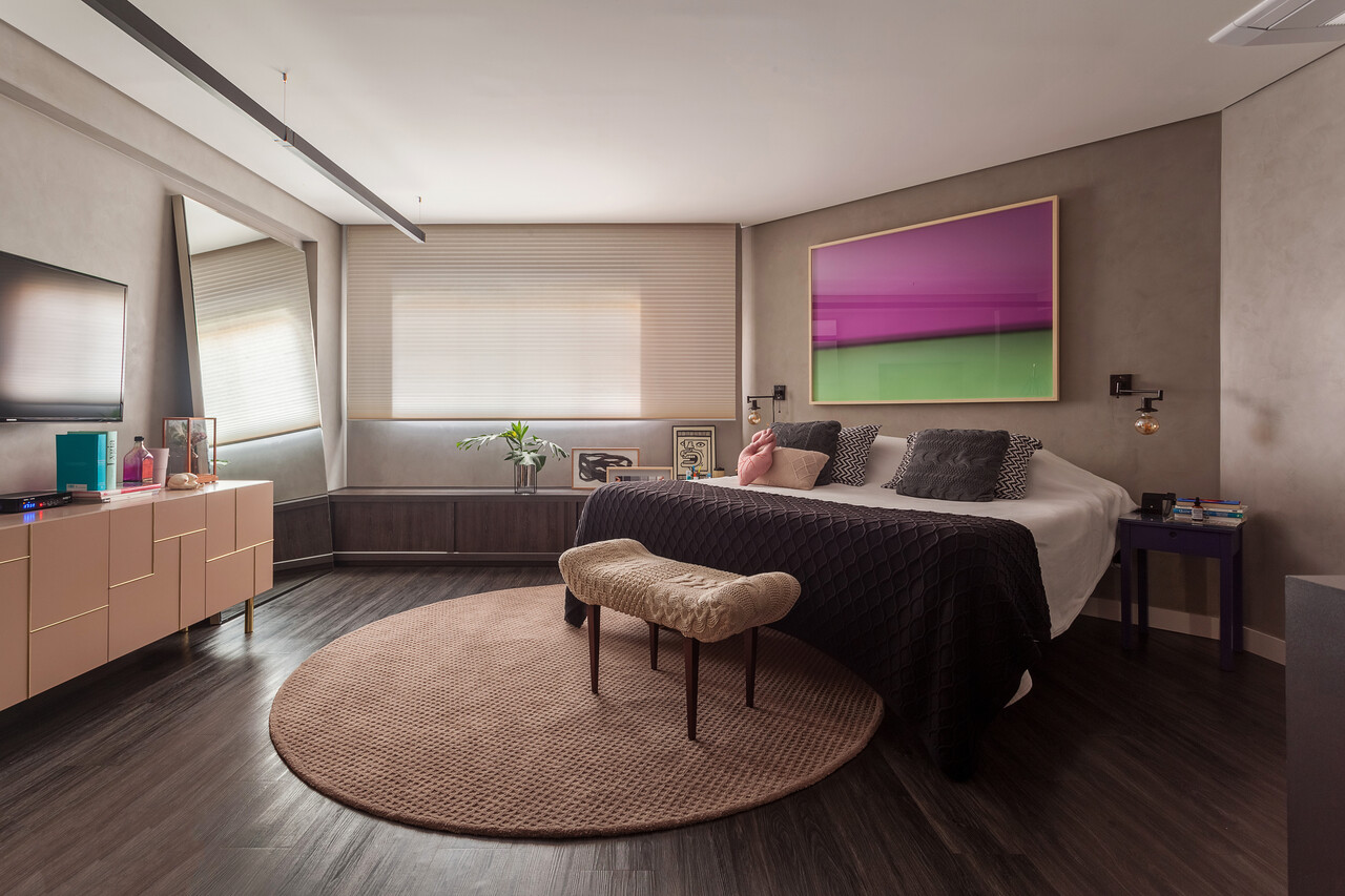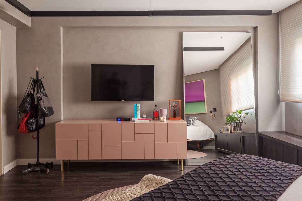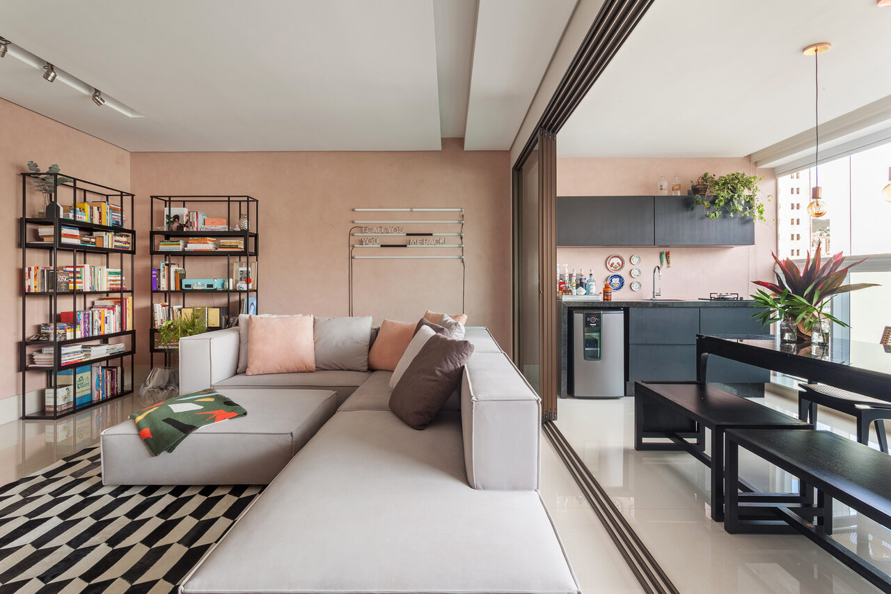 As clientes, quando adquiriram este apartamento, tinham em mente algumas referências. Uma delas, a cor rosa, a outra era ter um lar inspirado nos lofts nova-iorquinos. Lila trabalha no setor de tecnologia e Mariana na área de publicidade, e juntas desejavam transformar um apartamento de 4 quartos em um loft, para ter mais espaço, para ambas e um casal de cachorrinhos. Quem assina o projeto de interiores é a arquiteta Marina Dubal, da Dubal Arquitetura e Design.