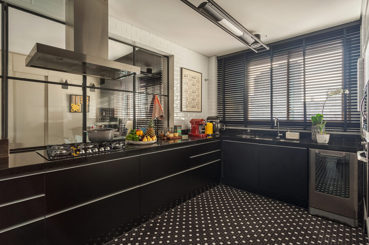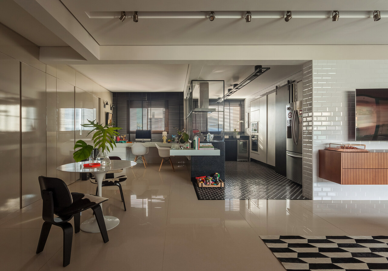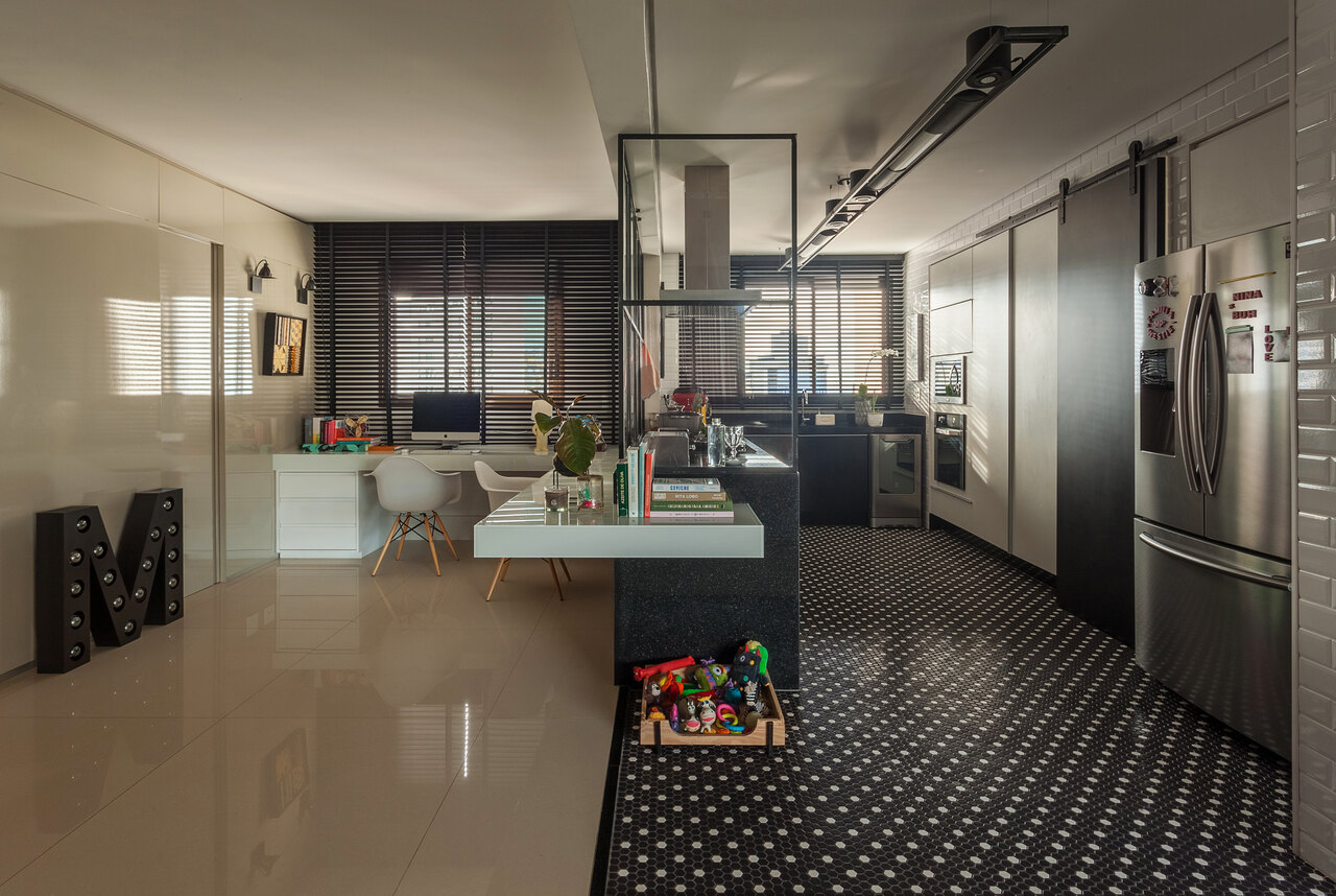 Na reforma, a prioridade foi a abertura visual, tanto na cozinha, criando também uma grande janela para a bancada do home office, quanto para a suíte master, que incorporou um quarto para ganhar closet e penteadeira. O piso da original sala foi mantido, mantendo elementos originais do apto. A cozinha recebeu revestimento estilo metrô, reforçando o conceito de loft sobretudo quando sai da cozinha e é usado na sala como pano de fundo da TV.