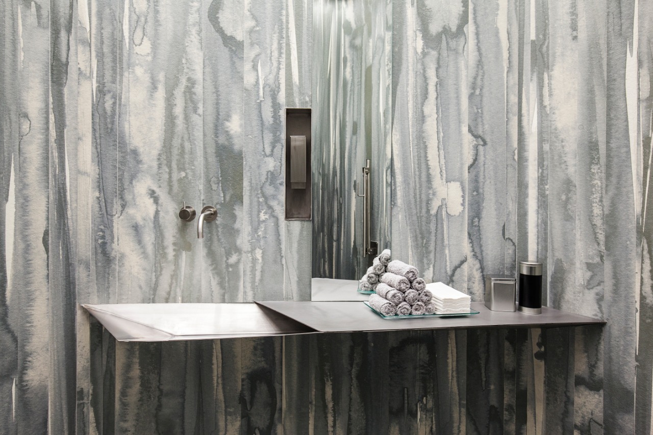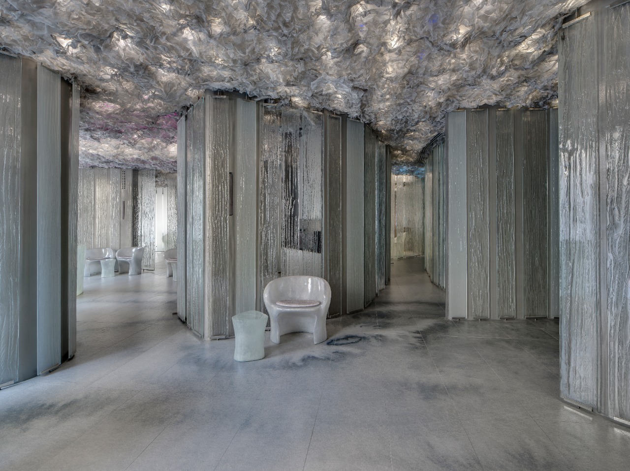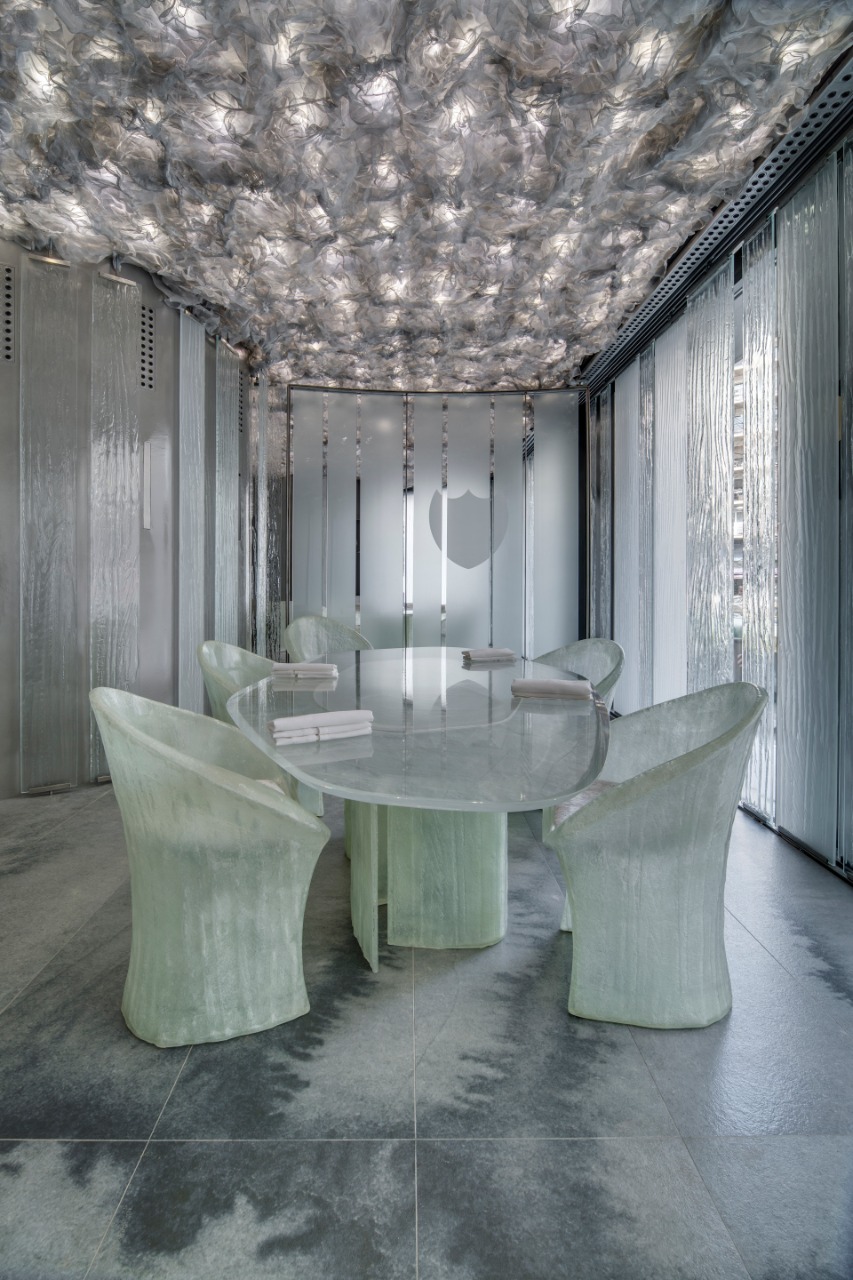 O mobiliário futurista possui o design criado também pelo RCR Architectes. A materialidade inspirada no gelo complementa a atmosfera fria criada pelas cores do revestimento.