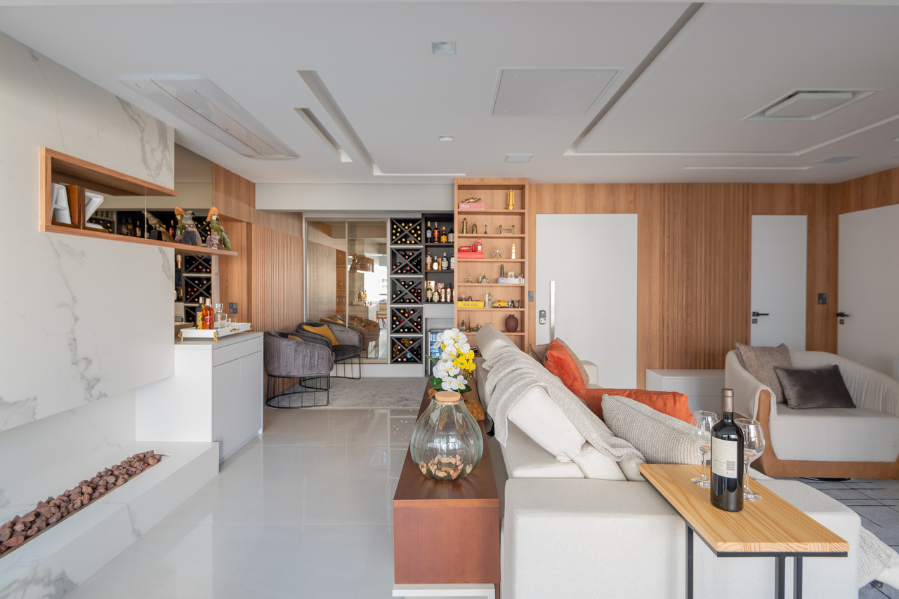 Logo na entrada do apartamento de 176 m², a luz natural invade os ambientes e traz a sensação de fluidez e amplitude, com a integração da área gourmet com o social. Paredes foram revestidas em madeira e em algumas partes com painéis ripados no living, para trazer a sensação de conforto e sofisticação, com revestimento no padrão Calacatta aplicado no painel da TV e também em uma lareira entre as salas.